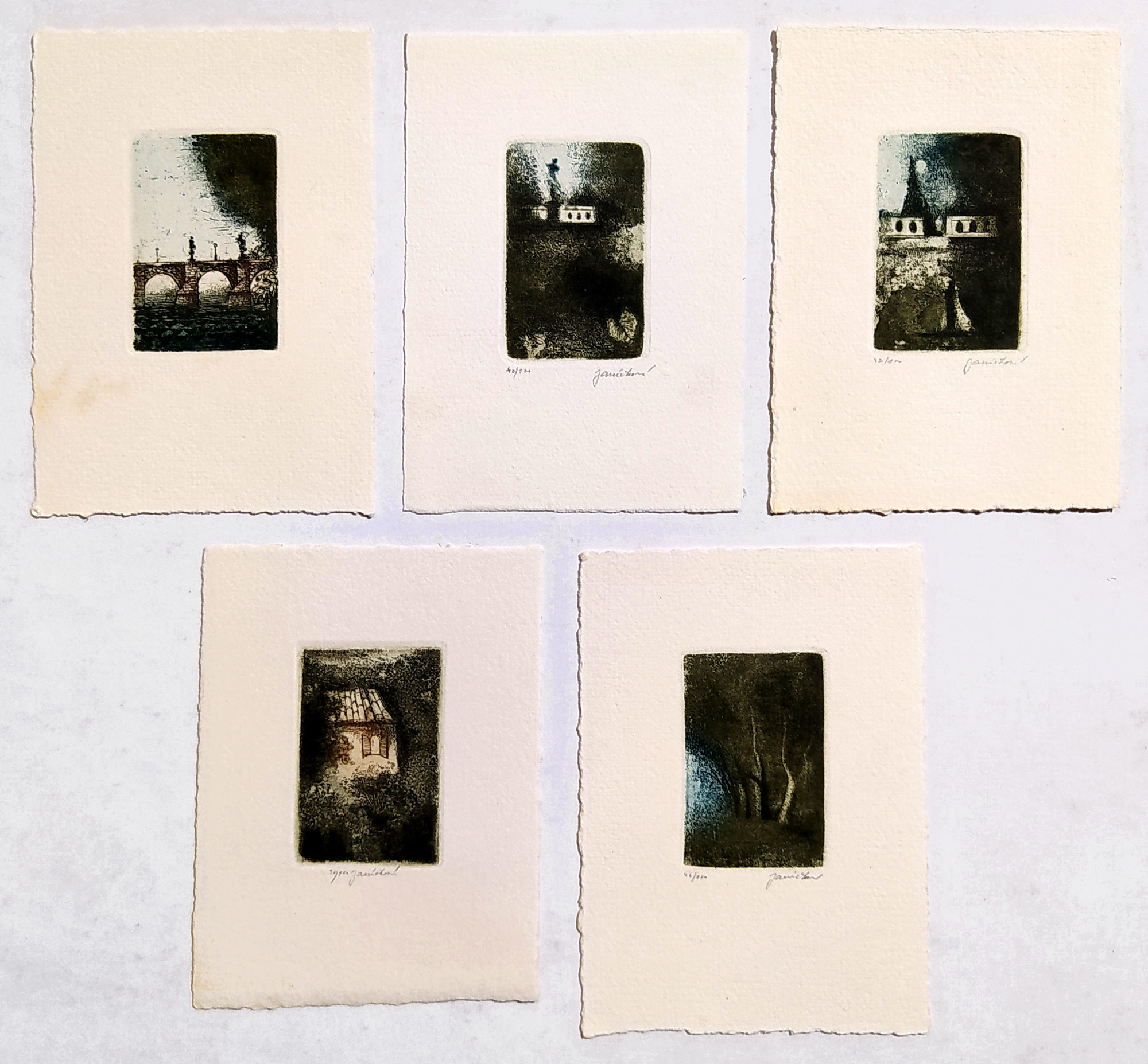 Janíčková Eva – Tajemství, 5 barevných leptů, nedatováno. Signováno tužkou vpravo dole. Celkový rozměr: á 12,7 cm × 9,1 cm.