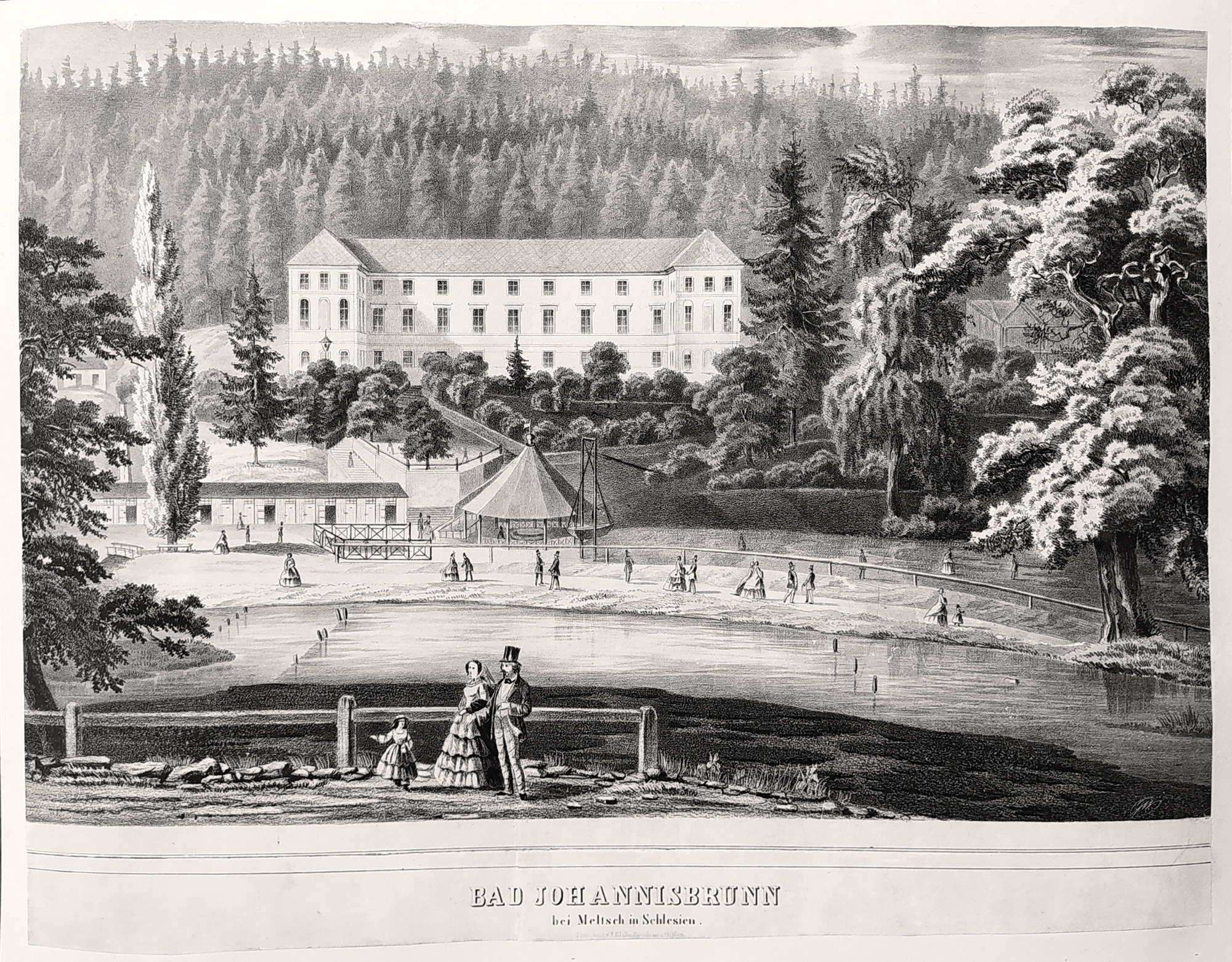 Jánské Koupele – Melčské lázně, F. Blaha, původní litografie, 1851–1861, Pohled na lázeňský areál po výstavbě nové lázeňské budovy z počátku padesátých let 19. století. Pod vyobrazením název listu: „Bad Johannisbrunn bei Meltsch in Schlesien“.