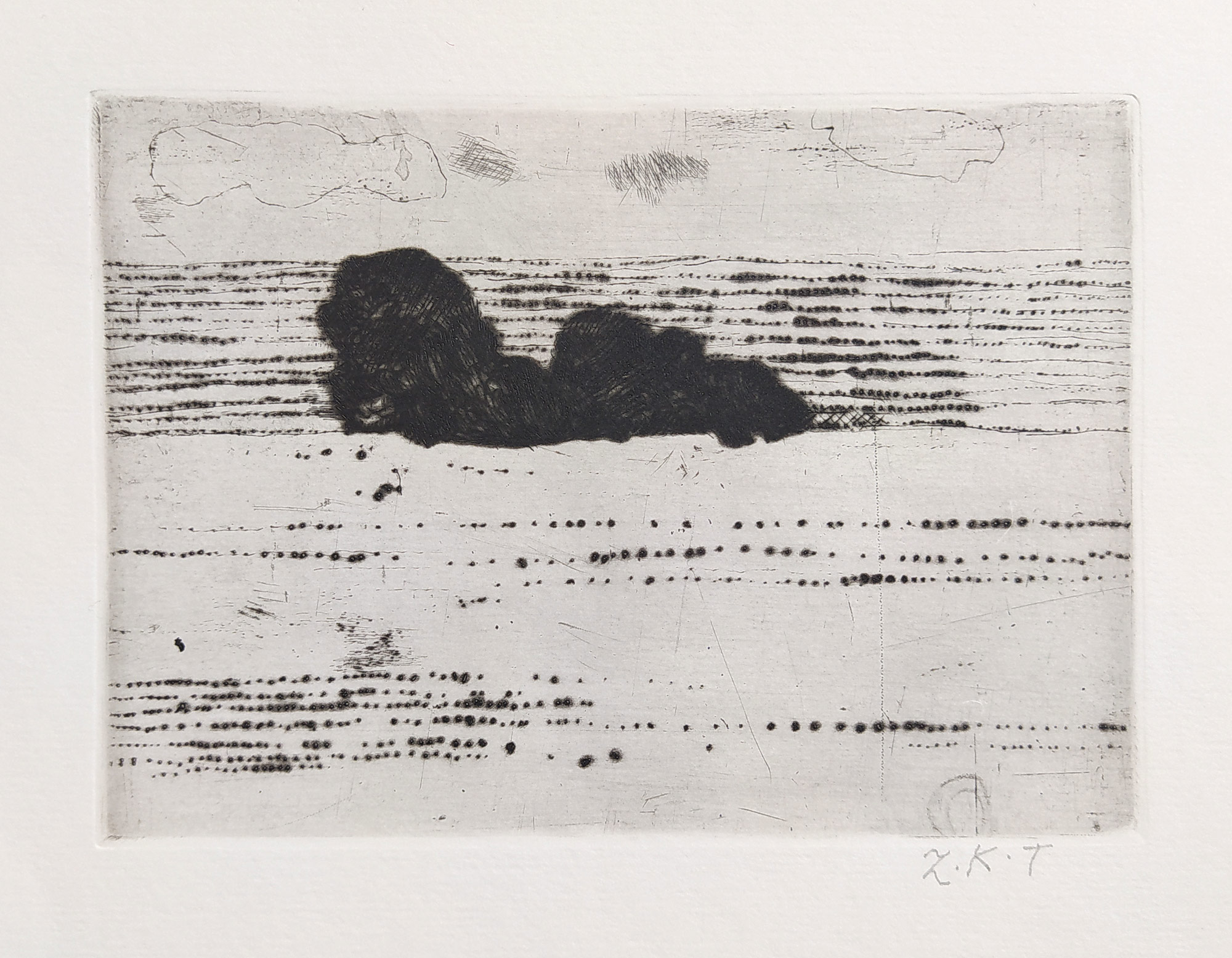 Zdena Kabátová-Táborská – Krajina, původní lept, nedatováno. Signováno tužkou vpravo dole Z. K. T. Celkový rozměr grafického listu: 29,9 cm × 26,1 cm.