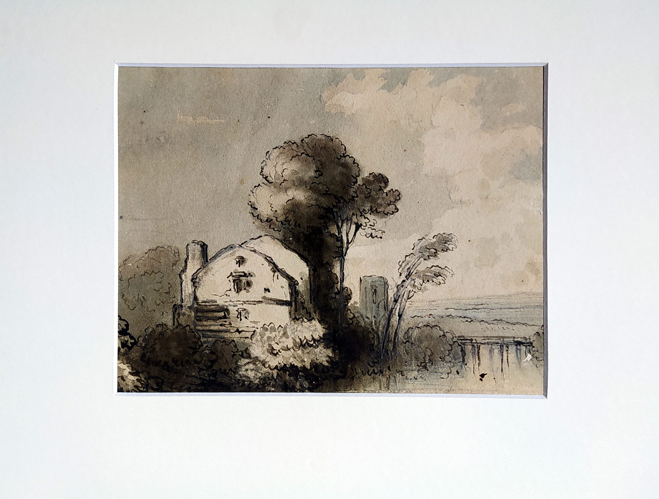 Neznámý autor – Krajina se stavením, akvarelem kolorovaná kresba tuší, ca 1800.