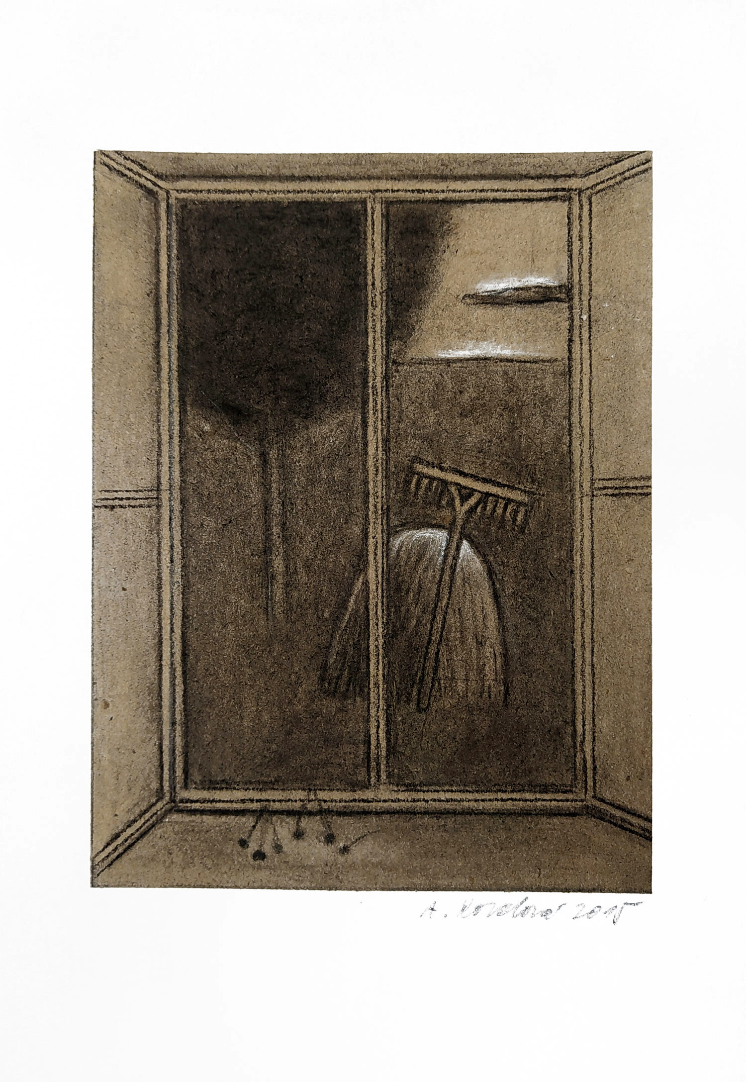 Kovalová Anežka – Červen, signovaná kresba uhlem, 2015. Signováno tužkou vpravo dole s datací. Celkový rozměr 24,1 cm × 16,5 cm.
