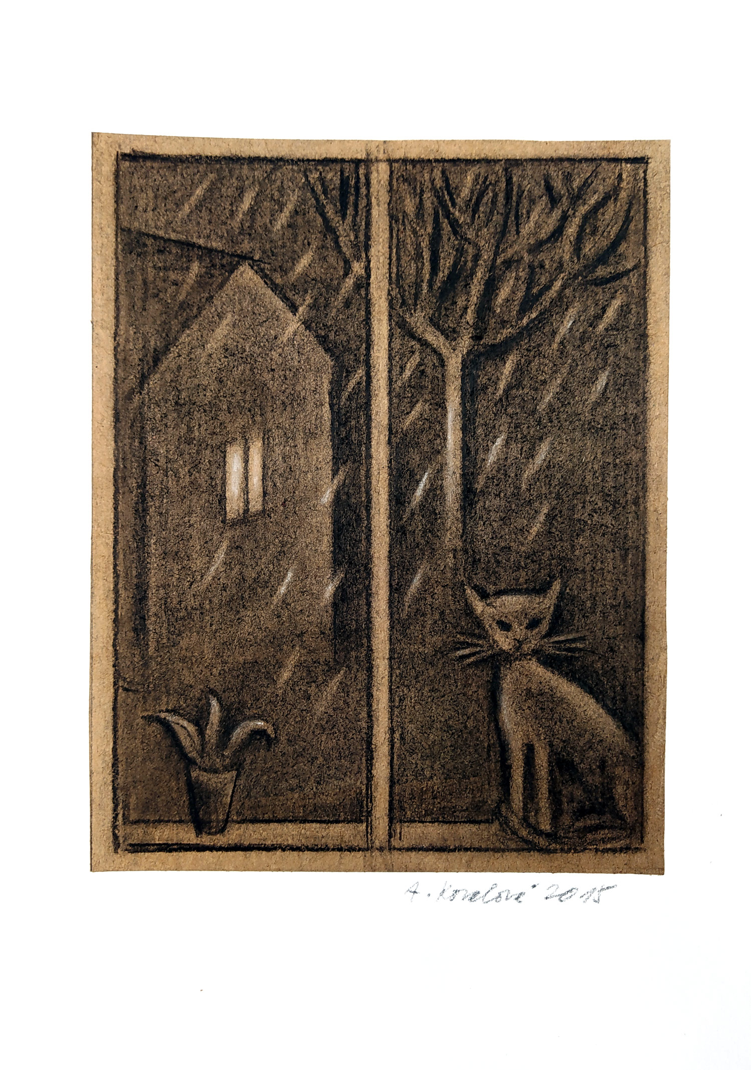 Kovalová Anežka – Listopad, signovaná kresba uhlem, 2015. Signováno tužkou vpravo dole s datací. Celkový rozměr 24,1 cm × 16,5 cm.