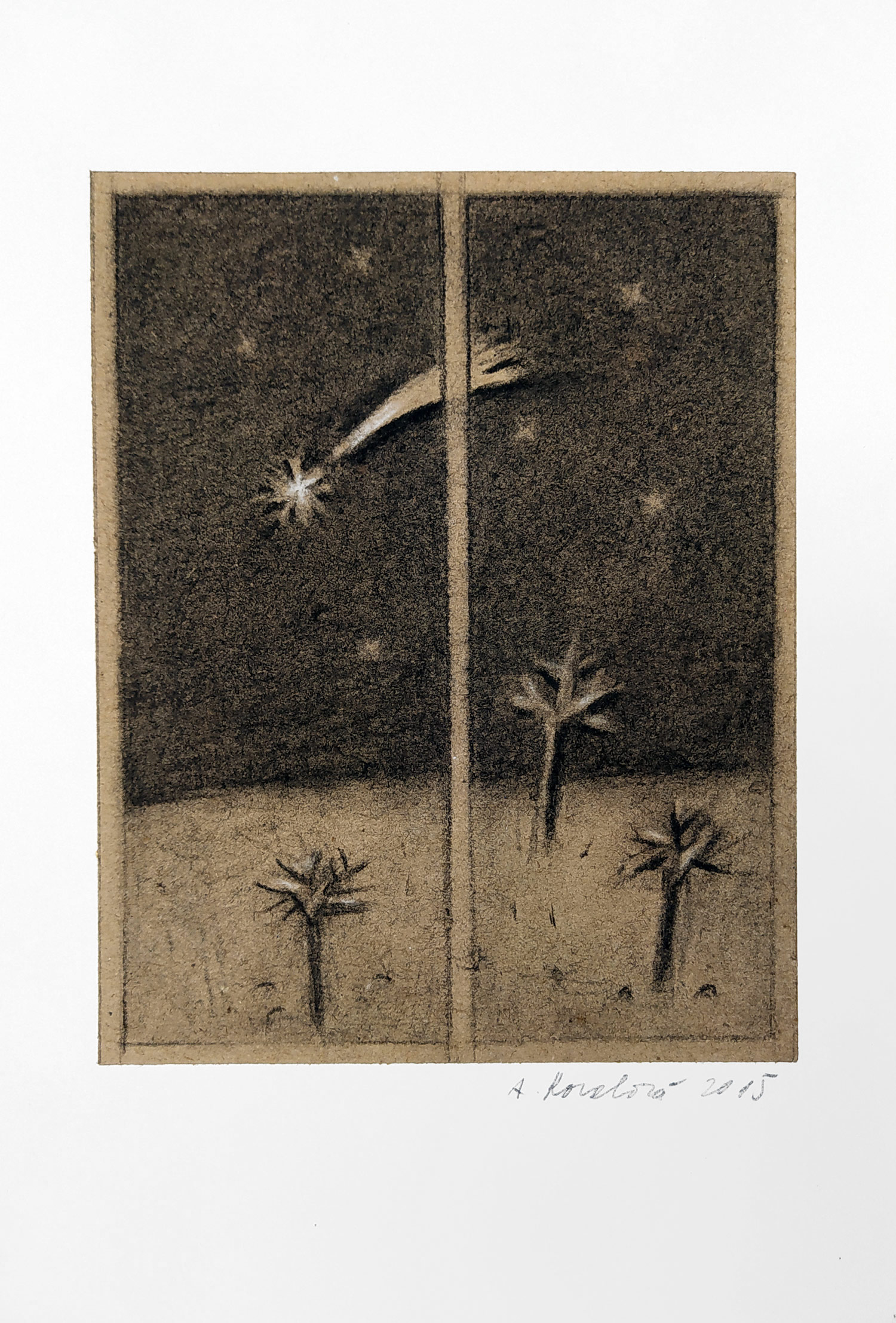 Kovalová Anežka – Prosinec, signovaná kresba uhlem, 2015. Signováno tužkou vpravo dole s datací. Celkový rozměr 24,1 cm × 16,5 cm.