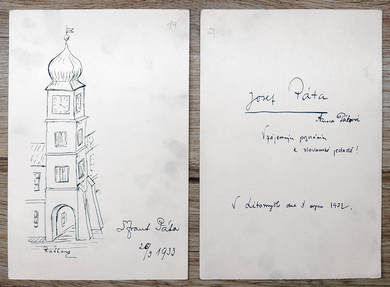 Dva listy z památníku: Páta František – Radnice v Litomyšli, kresba perem, 26. 3. 1933 a Páta Josef s Pátovou Annou. Celkový rozměr: 2 ks á 20,4 cm × 13,6 cm.