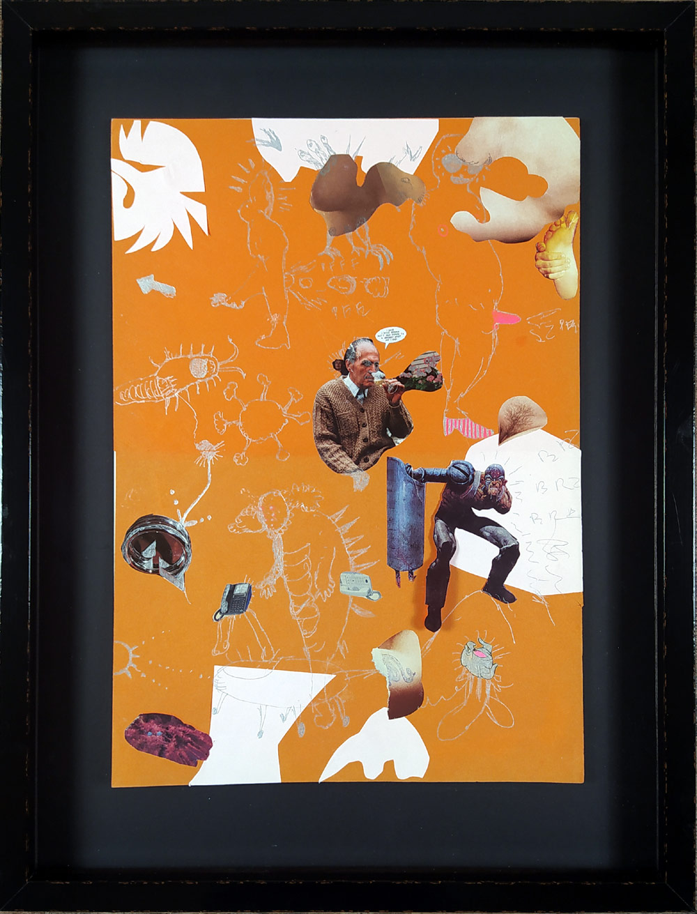 Bolf Josef – Koláž, stříbrný fix na papíře, 2009. Raritně se vyskytující koláž z raného „komiksového“ období. Celkový rozměr v rámu: 55,5 cm × 42,4 cm.