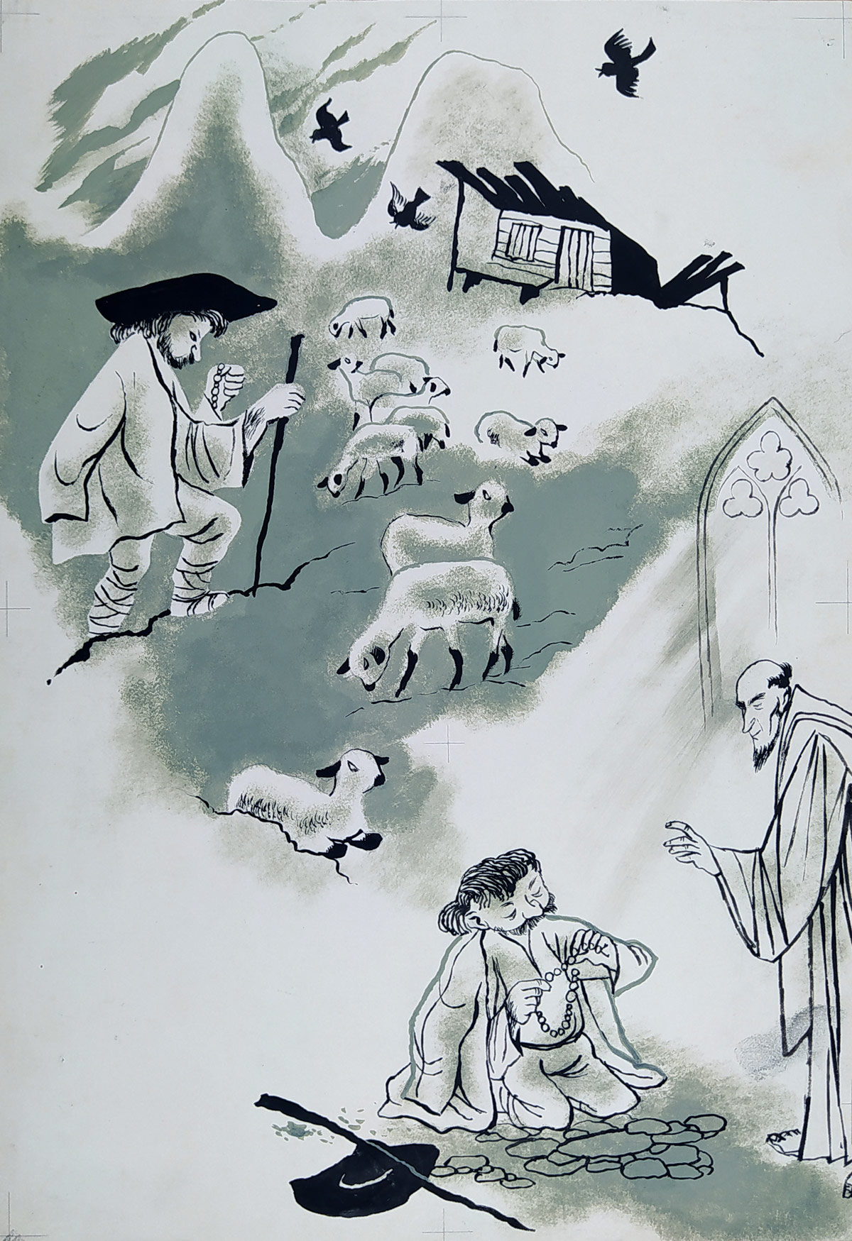 Burjanek Josef – Pastýř z hor, knižní ilustrace, kresba tuší kolorovaná akvarelem, 1942. Celkový rozměr: 29,4 cm × 20,6 cm.