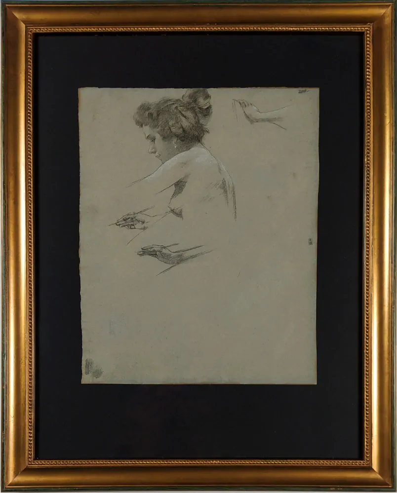 Špillar Karel – Múza, studie k obrazu, kresba tužkou a bílou křídou, ca 1900