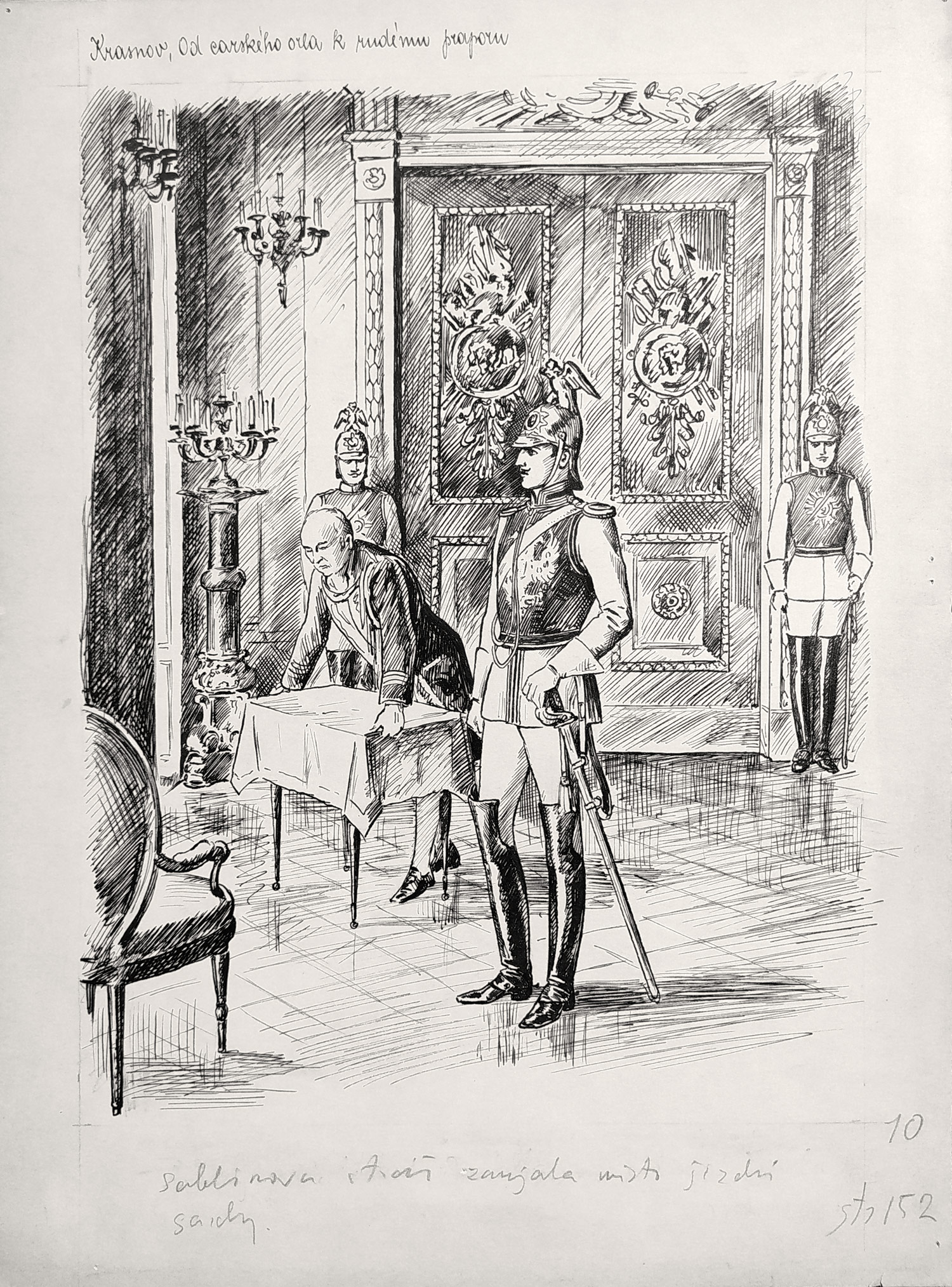 Wowk Jiří – Od carského orla k rudému praporu, knižní ilustrace, str. 152, kresba tuší, 1930Prodáno/ ks