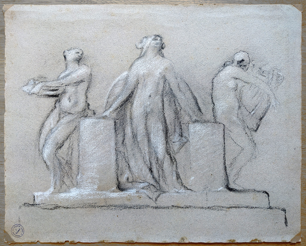 Šaloun Ladislav Jan – Plzeň, návrh umělecké výzdoby, Divadlo J. K. Tyla, kresba uhlem, 1897. Nesignováno, razítko: Pozůstalost po národním umělci L. Šalounovi.