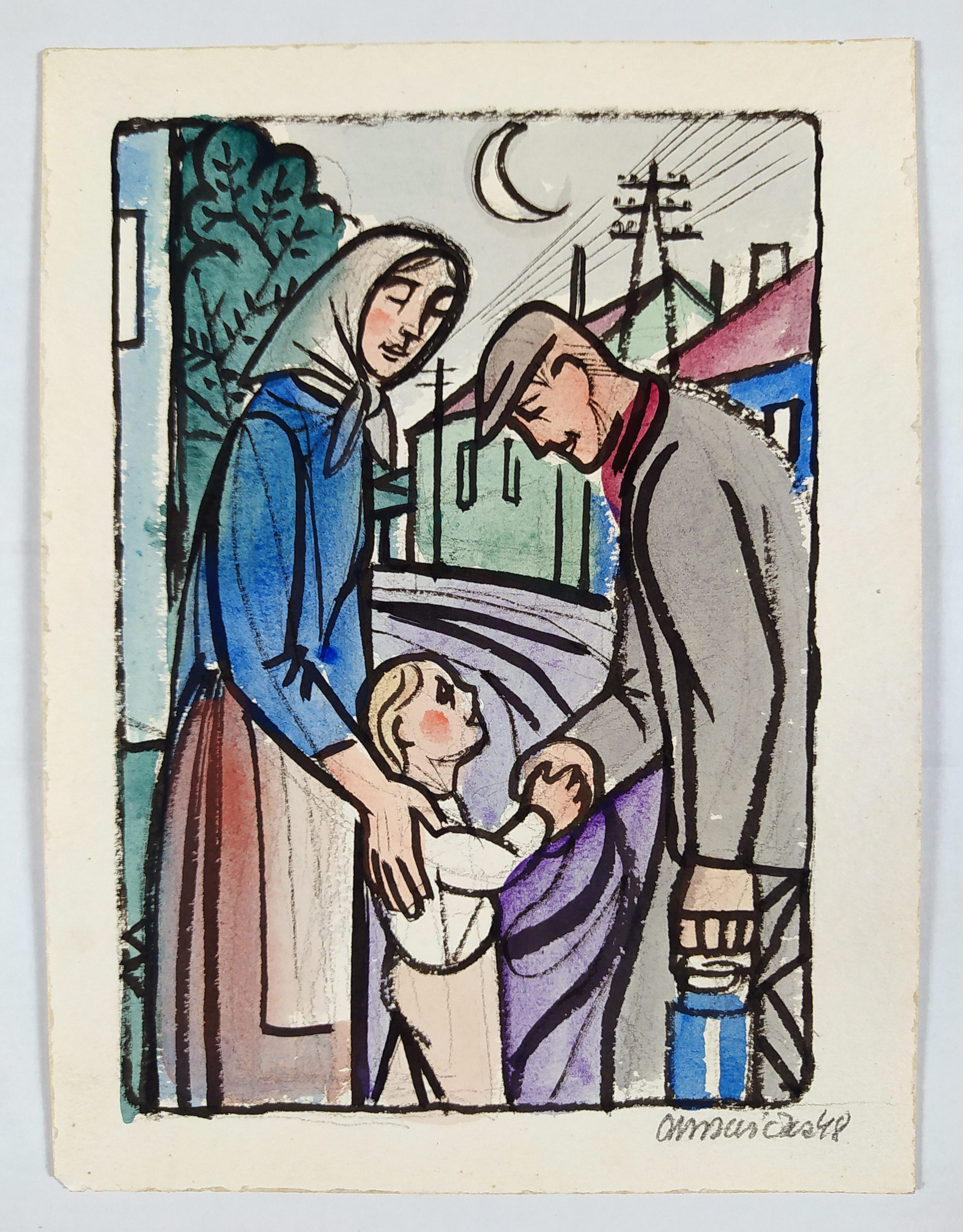 Mrkvička Otakar – Loučení, akvarelem kolorovaná kresba tuší, 1948. Signováno tužkou vpravo dole s datací. Celkový rozměr 23,2 cm × 17,5 cm.
