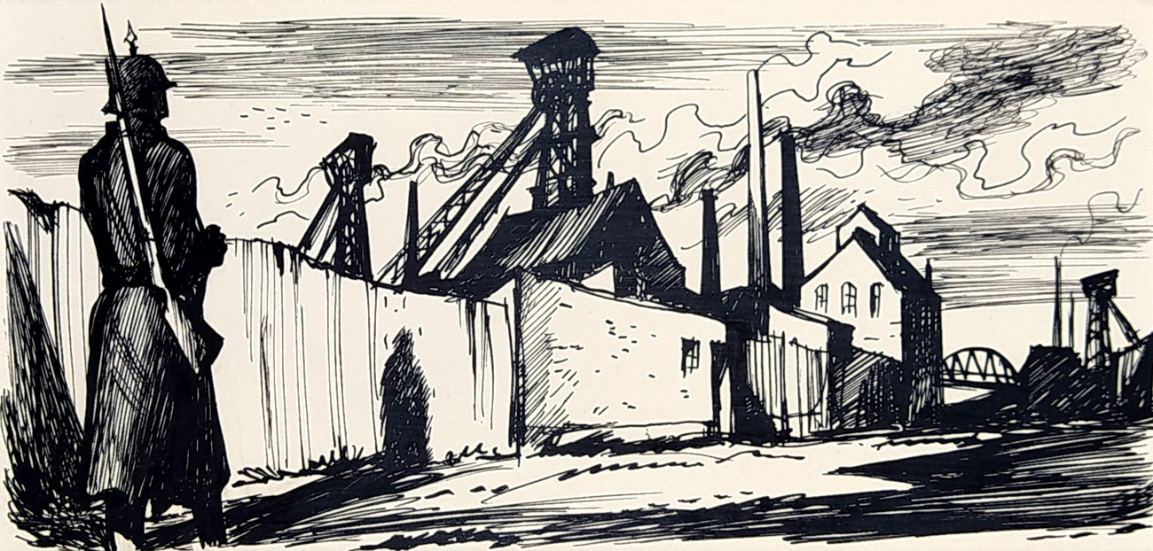 Šimon Pavel – Stráž u továrny, kresba tuší, ca 1947.