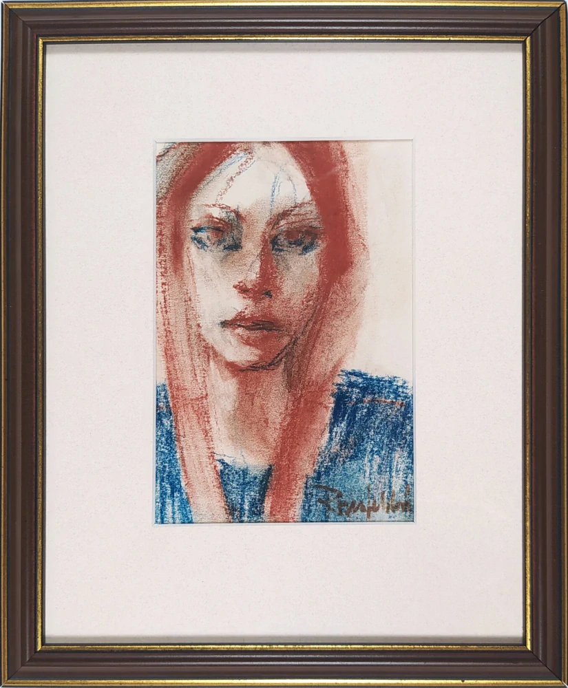 Rosenfeldová Radomíra – Dívčí portrét / Inspirace I., suchý pastel, nedatováno. Na rubové straně původní štítek DÍLO ČFVU s popisem díla. Celkový rozměr v rámu: 27,3 cm × 22,4 cm.