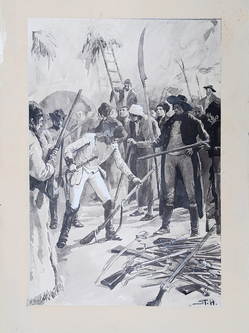 Hudeček Stanislav – Sedláci u Chlumce, lavírovaná kresba tuší, 1915. Realizovaná ilustrace z knihy Josefa Svátka: Sedláci u Chlumce, Praha, nakladatel Fr. Topič, 1915. Celkový rozměr 45 cm × 33,4 cm.