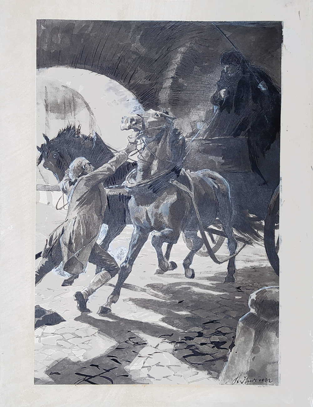 Hudeček Stanislav – Sedláci u Chlumce, lavírovaná kresba tuší, 1915. Realizovaná ilustrace z knihy Josefa Svátka: Sedláci u Chlumce, Praha, nakladatel Fr. Topič, 1915. Celkový rozměr 43,2 cm × 33 cm.