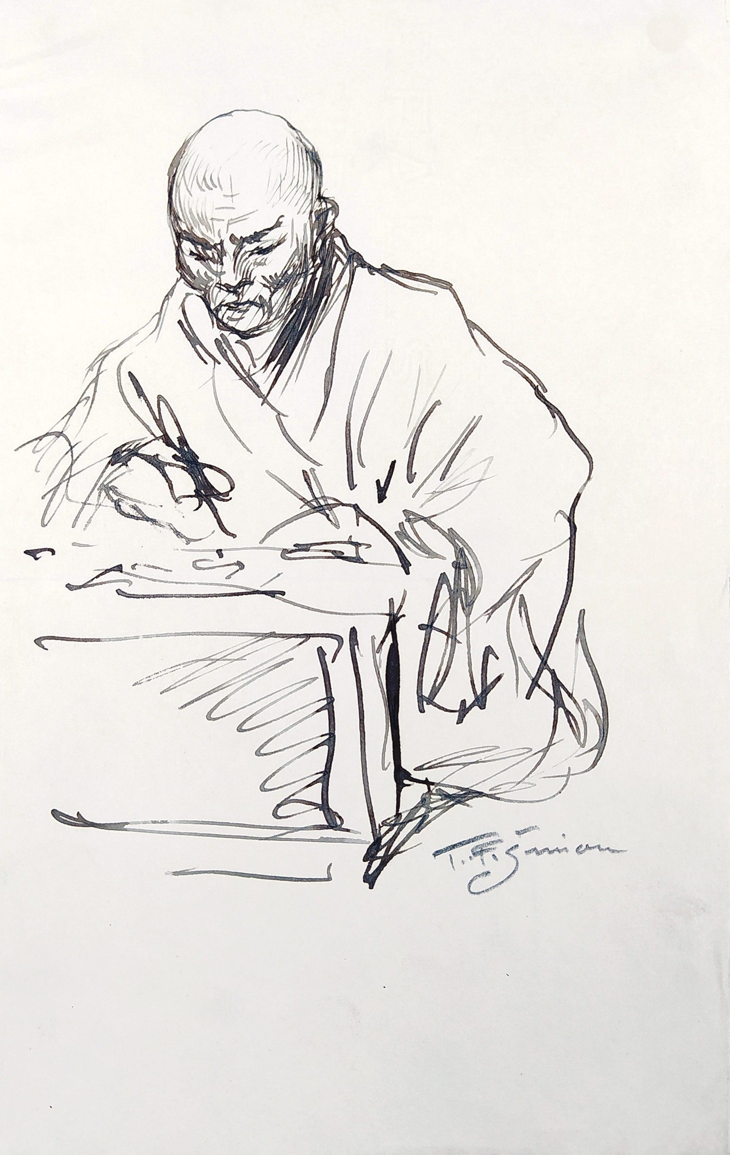Šimon Tavík František – Studie muže, kresba perem, ca 1927. Kresba z autorovy cesty kolem světa (vydalo nakladatelství J. Otto, spol. s.r.o. v Praze 1927). Signováno tužkou vpravo dole. Celkový rozměr: 20,4 × 12,8 cm.