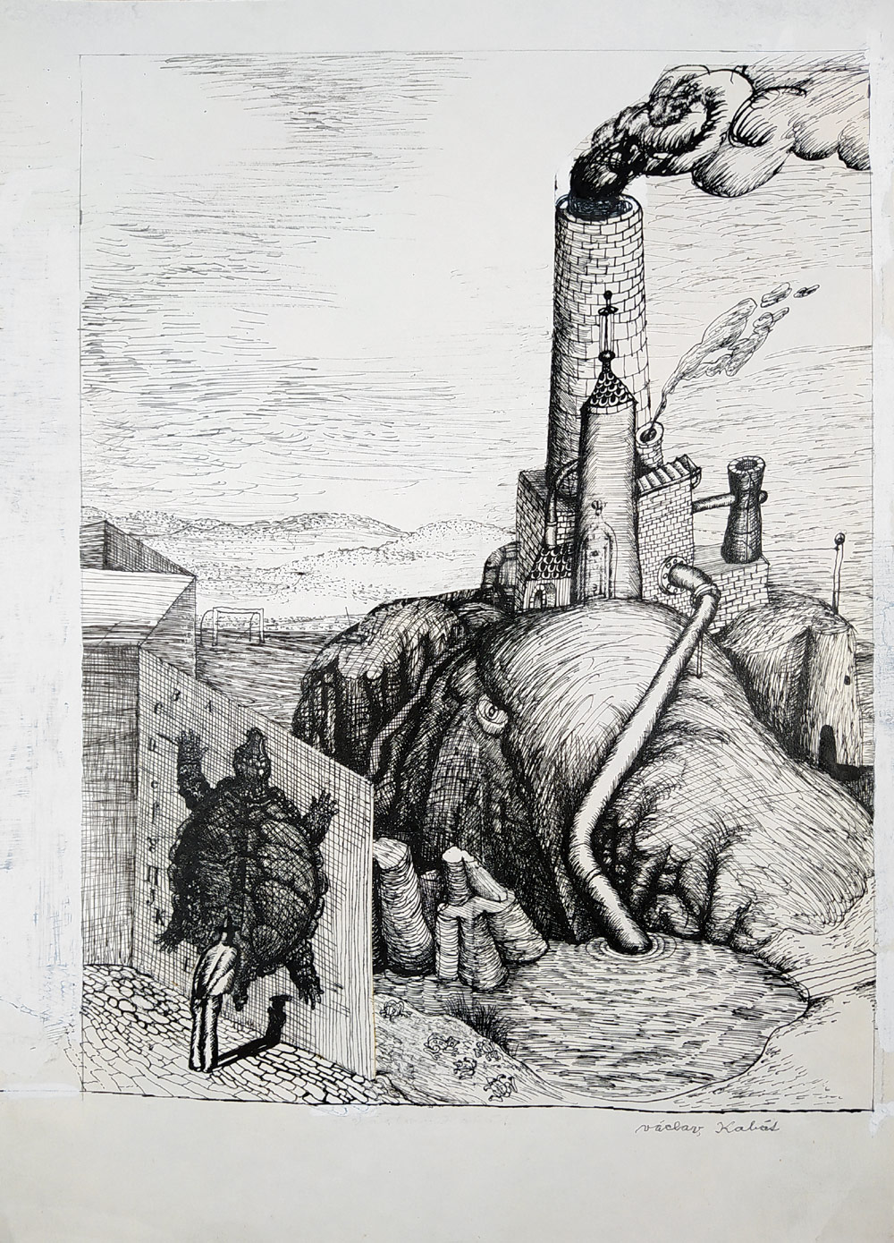 Kabát Václav – knižní ilustrace, Želva a žáby, perokresba, kombinovaná technika, nedatováno. Ilustrace pro Ezop: Želva a žáby. Celkový rozměr: 41,2 cm × 29,3 cm.