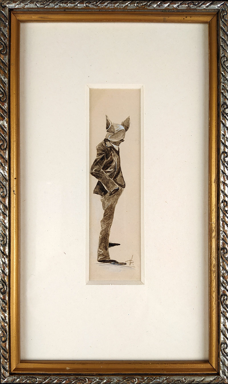 Oliva Viktor – Muž s maskou, kresba tuší a bělobou, ca 1900. Celkový rozměr v rámu: 26,8 cm × 15,5 cm. Signováno tuší vpravo dole „VO“.