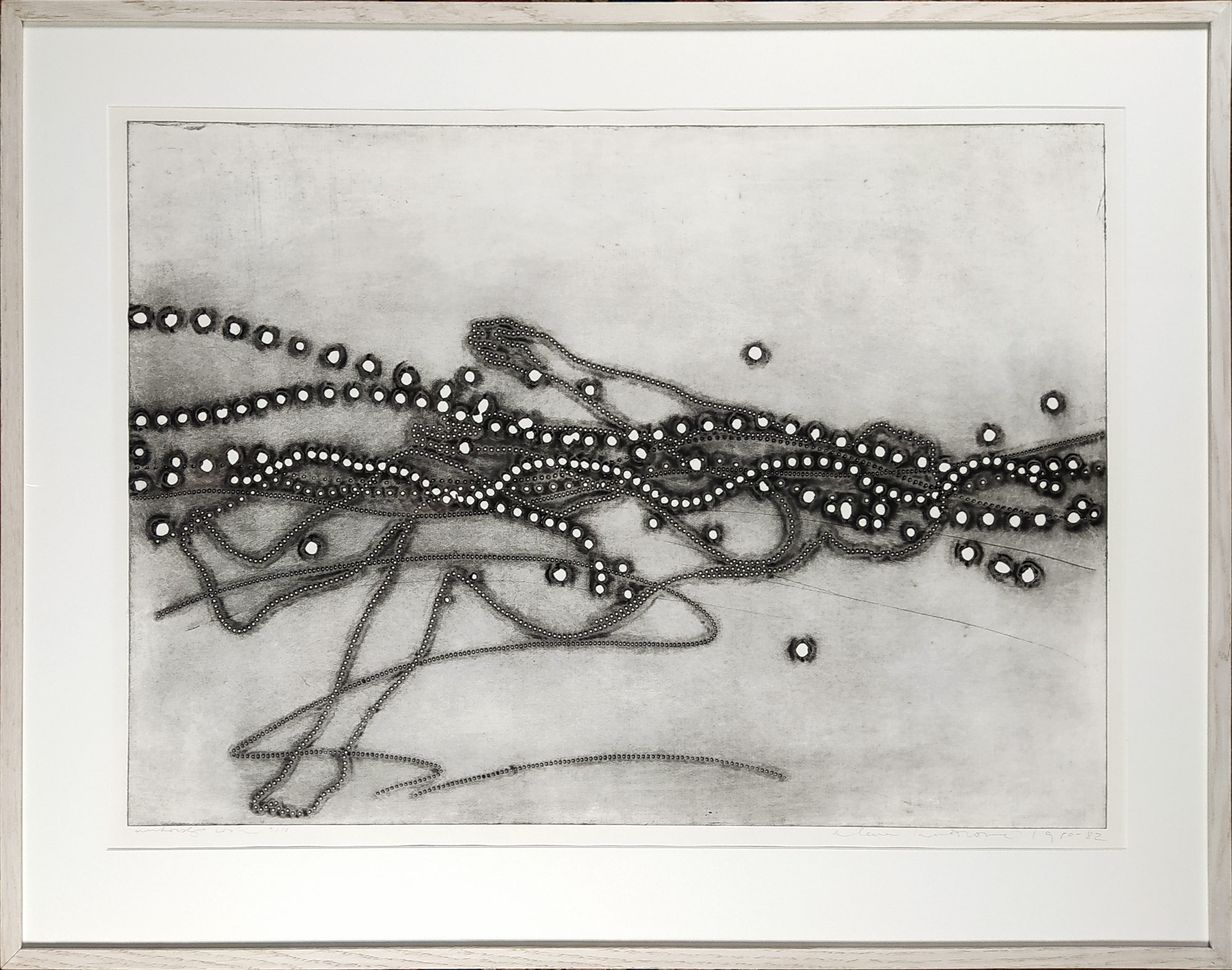 Kučerová Alena – Hladina / Water Surface, autorský tisk z perforovaného plechu, 1980–1982. Dílo zobrazuje téma, kterému se autorka věnuje dlouhodobě – tzv. plavecké motivy, pohyb ve vodě a přírodě, často s figurativními prvky stylizovanými do tečkovaných linií.