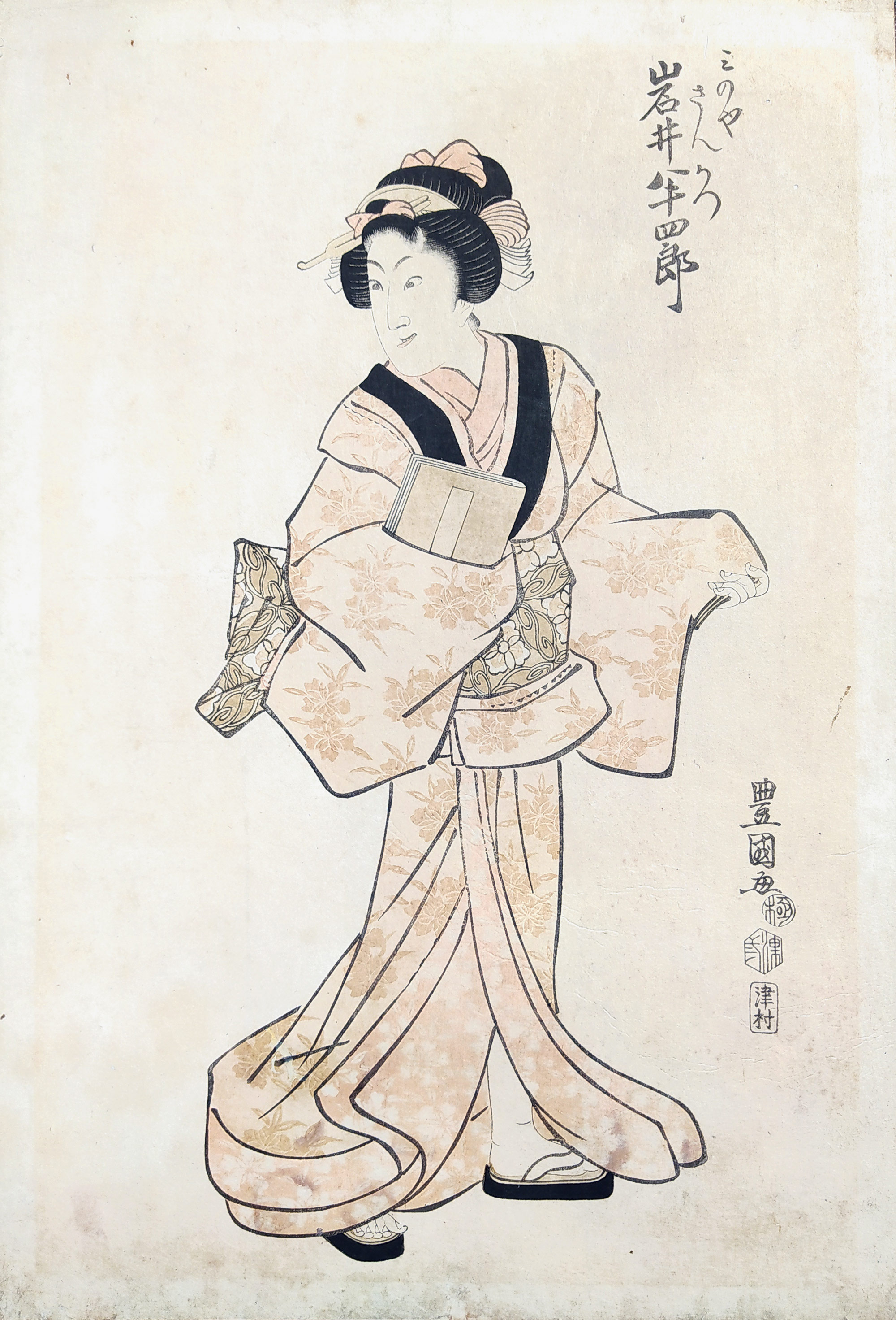 Kunisada Utagawa – Ukio–e, Portrét ženy s knihou, staře kolorovaný původní dřevořez, ca 1820