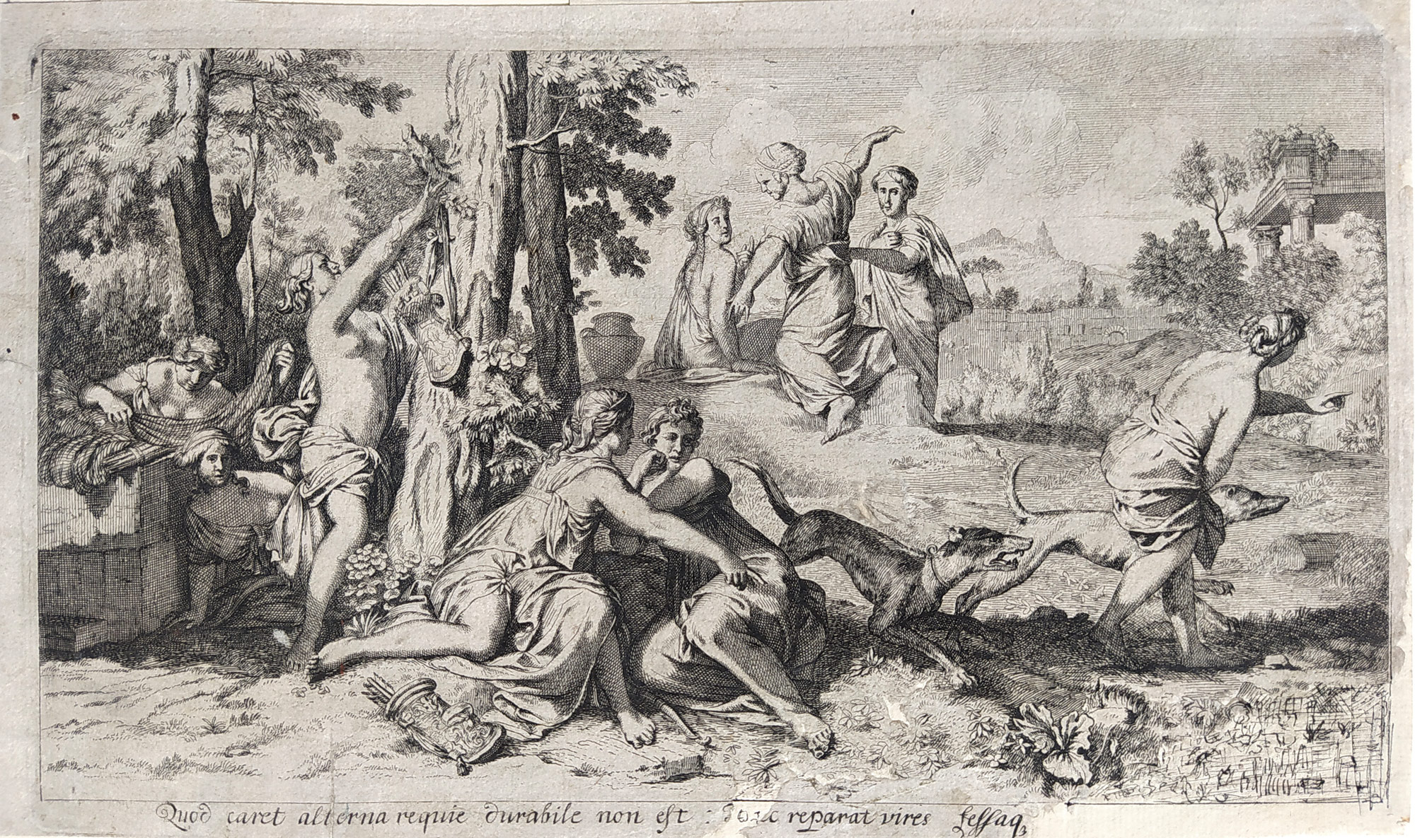 Lairesse, Gerard de – Diana a její společnice po lovu (1675), lept a suchá jehla, stranově převráceno, ca 1700