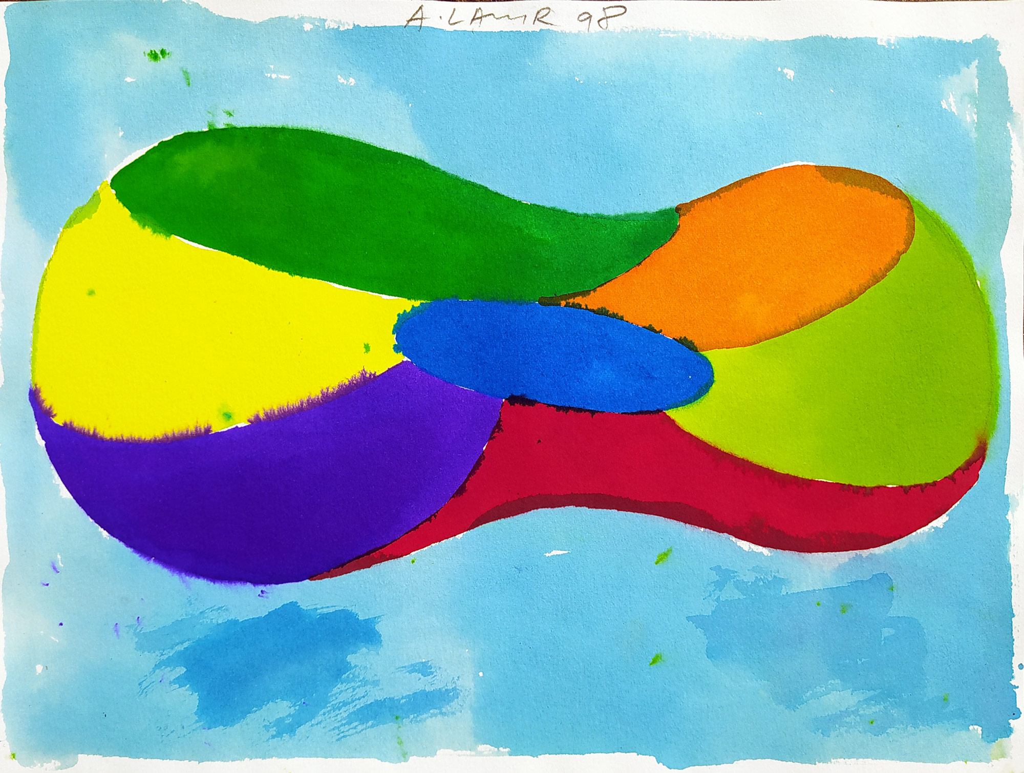 Aleš Lamr – Bez názvu, akvarelem kolorovaná kresba, 1998. Signováno tužkou uprostřed nahoře s datací. Celkový rozměr: 22,9 cm × 30,8 cm.