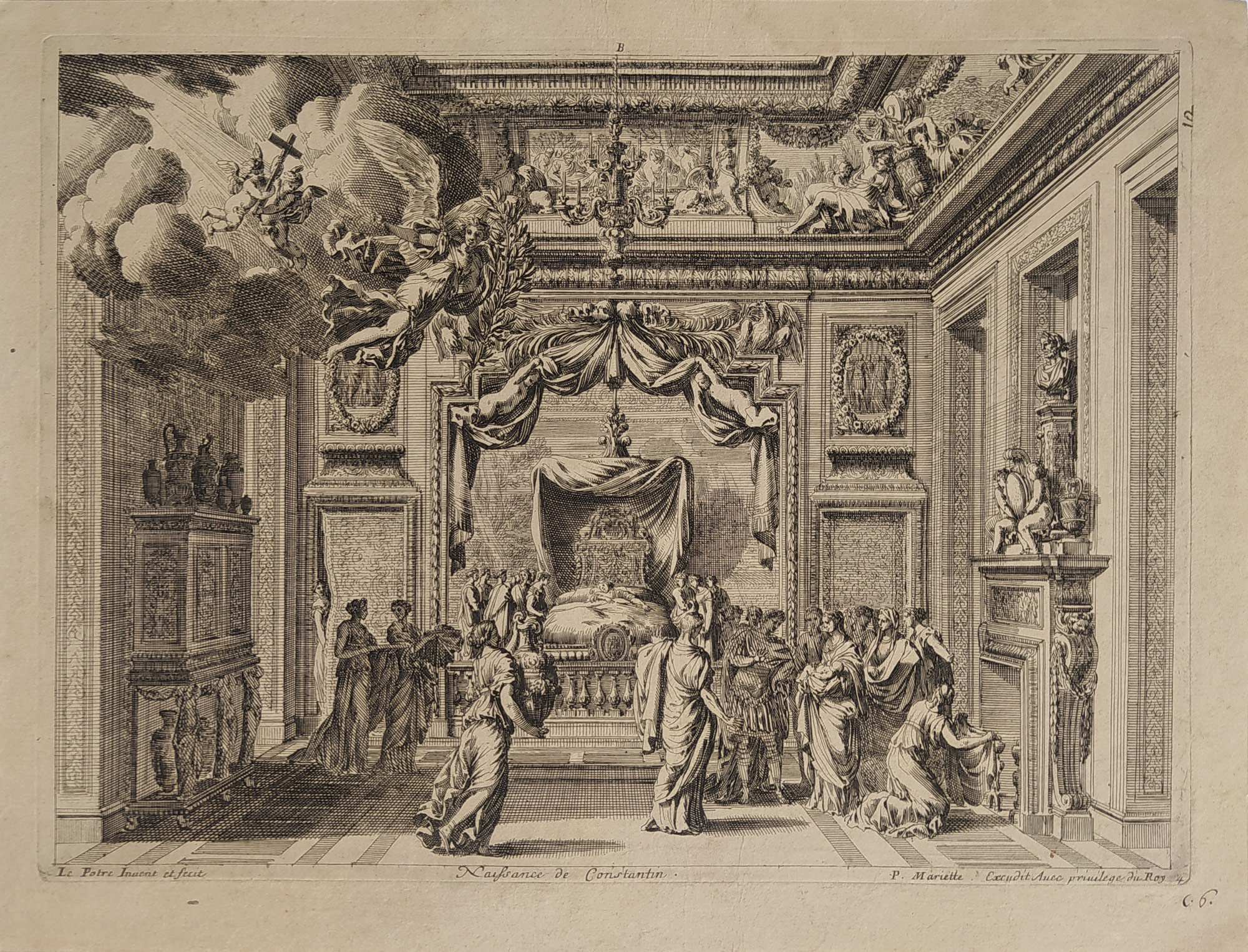 Lepautre Jean – Narození Konstantina, původní lept, 1667. Z díla „Grand alcoves a la romaine“, vydané v Paříži r. 1667. Celkový rozměr: 26,5 cm × 34,8 cm.