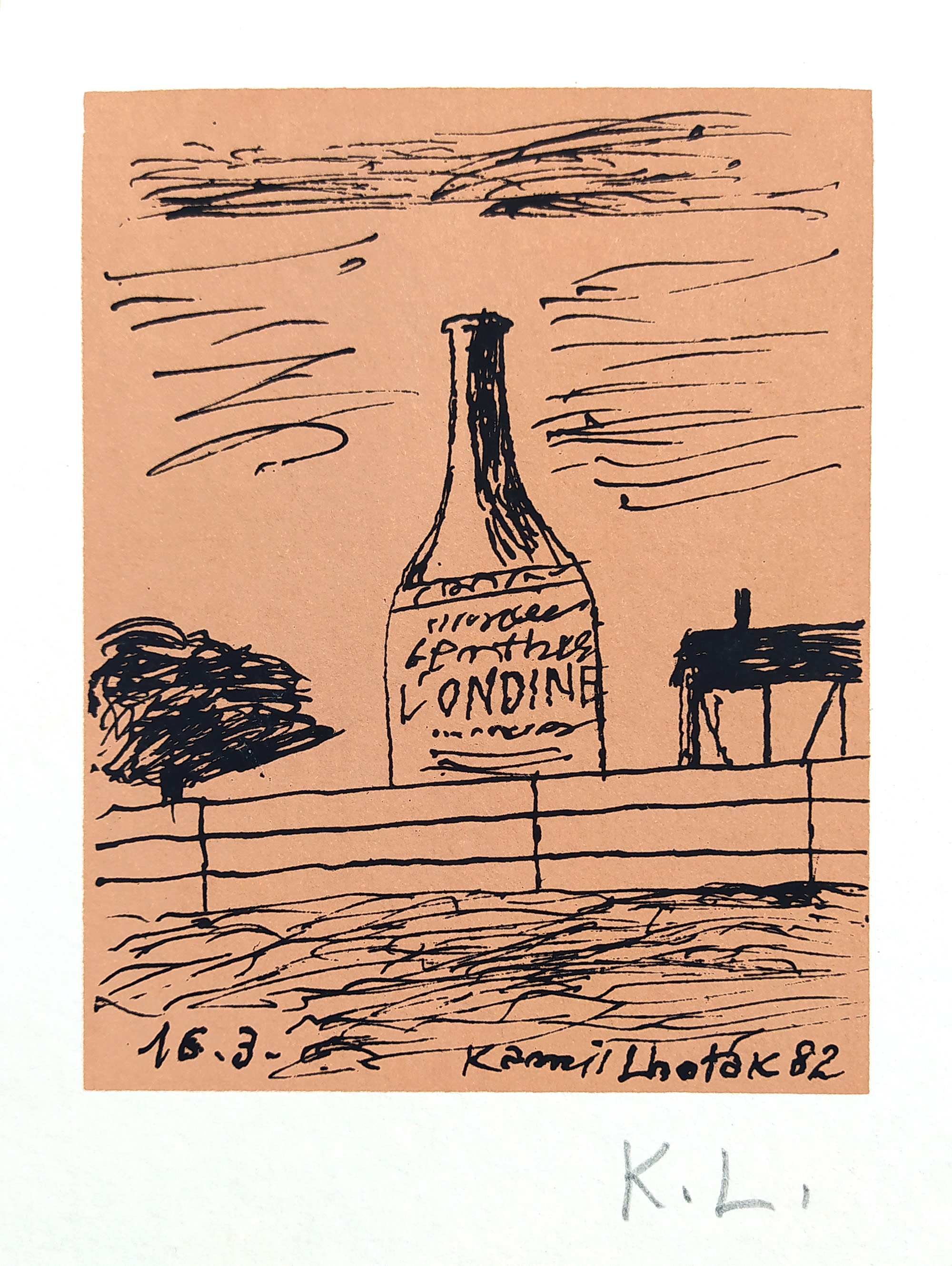 - Signatura: typograficky vpravo dole v desce s datací, tužkou vpravo dole K.L.