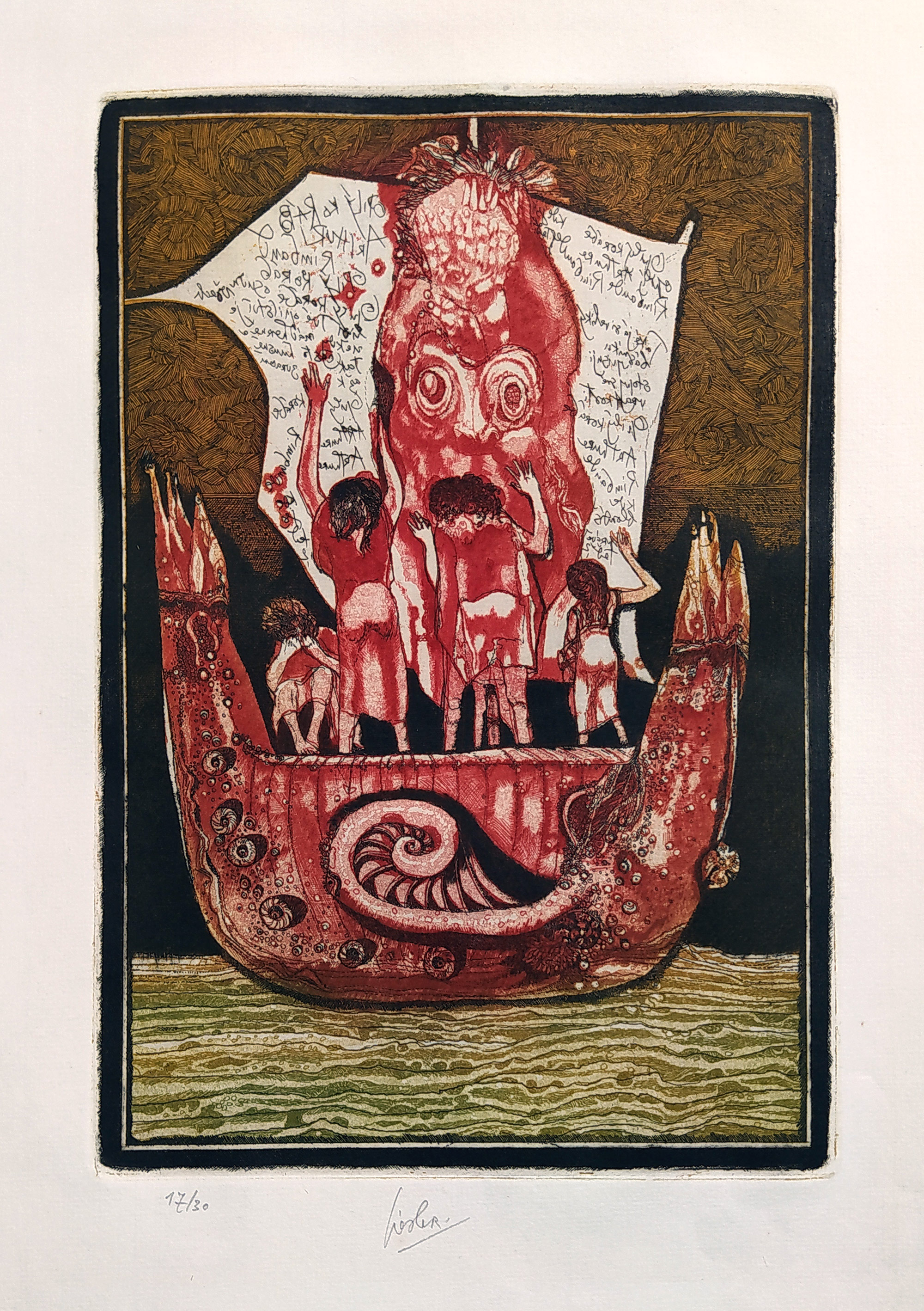 Josef Liesler – Opilý koráb, barevný lept, číslováno 17/30, nedatováno. Signováno tužkou uprostřed dole. Celkový rozměr: 39,2 cm × 29,7 cm.