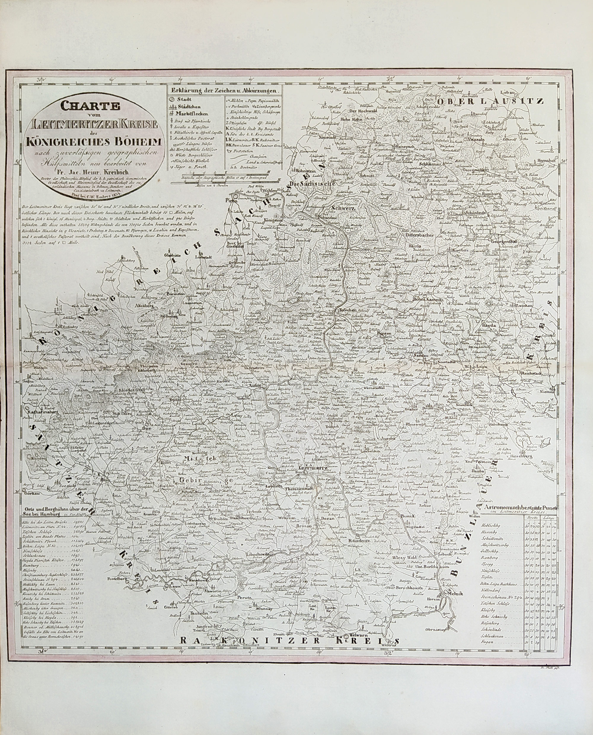 Litoměřický kraj – František Jakub Jindřich Kreibich, staře kolorovaný původní mědiryt, 1834. V oválné kartuši název: „Charte vom Leitmeritzer Kreise des Königreichs Böheim … Prag 1834“. Vydal Carl Wilhelm Enders v Praze. Celkový rozměr: 53,1 cm × 42,8 cm.