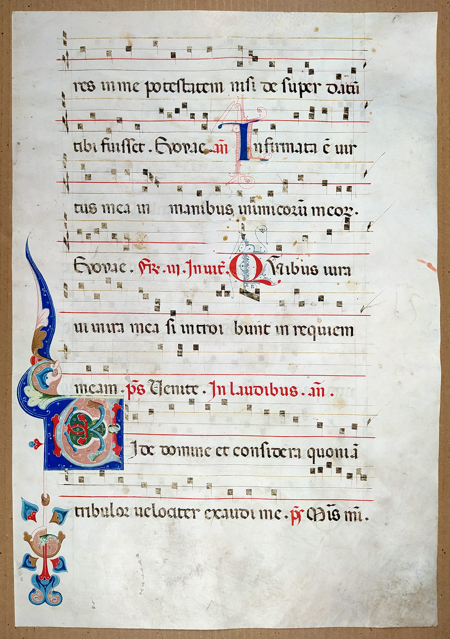 Antifonář – Notový záznam z liturgické knihy, oboustranná malba na pergamenu, 1. pol. 14. stol.