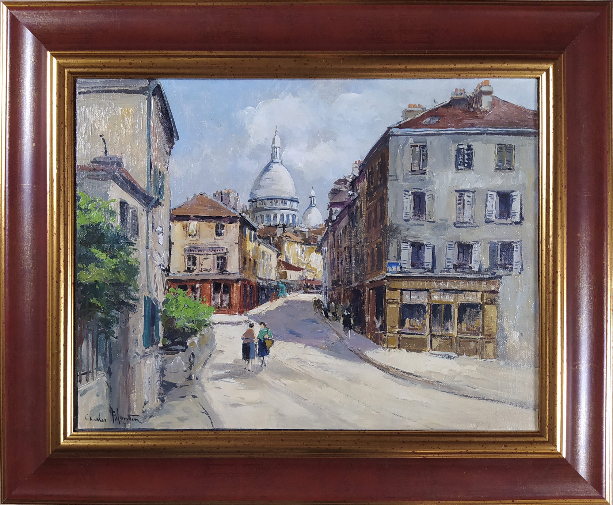 Blondin Charles – Paříž, Rue Norvins na Montmartru, olej na plátně, nedatováno. Signováno vlevo dole. Celkový rozměr v rámu: 45,0 cm × 52,8 cm.