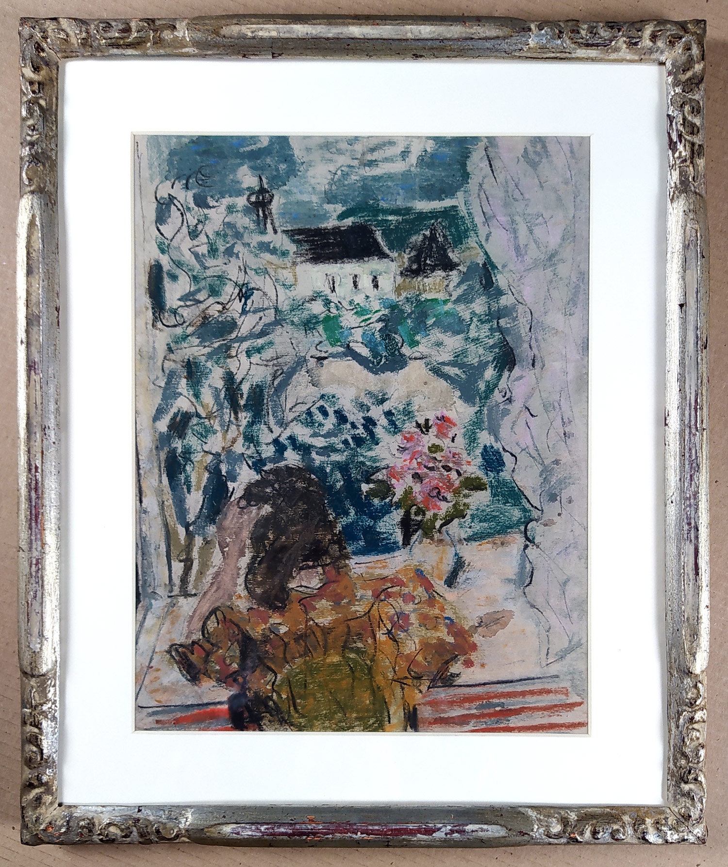 Vobecký František – Čtenářka u okna, malba suchým pastelem, 30. léta. Na rubu razítko: Pozůstalost František Vobecký. Celkový rozměr v rámu: 44,2 cm × 36,9 cm.