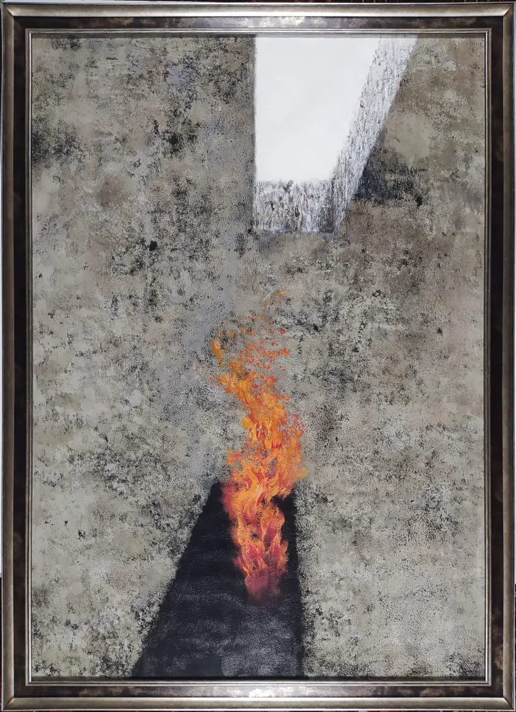 Husák Milivoj – Hrob plamene, malba, silikát, popel, akryl, 2024. Signováno tužkou na rubu s datací. Celkový rozměr v rámu: 108,8 cm × 78,0 cm.