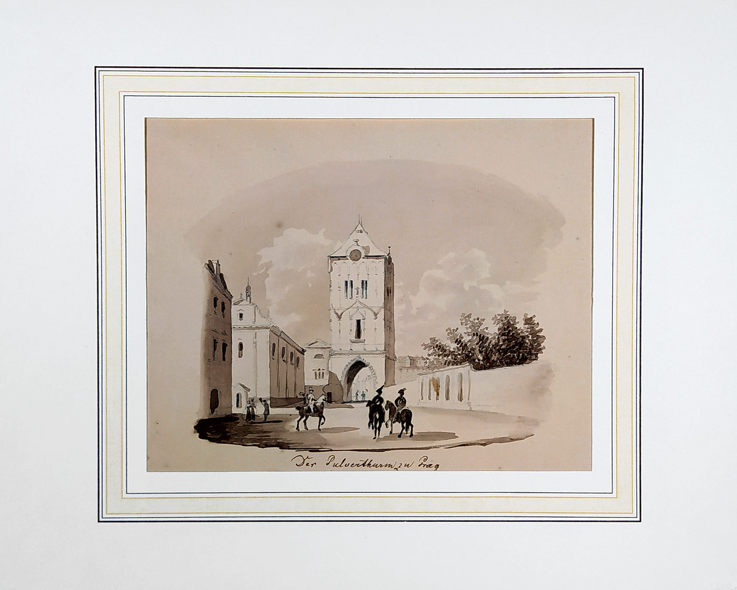 Praha – Prašná brána, Der Pulverthurm zu Prag, malba tuší, 2. polovina 19. století. Celkový rozměr: 24,1 cm × 30,0 cm.
