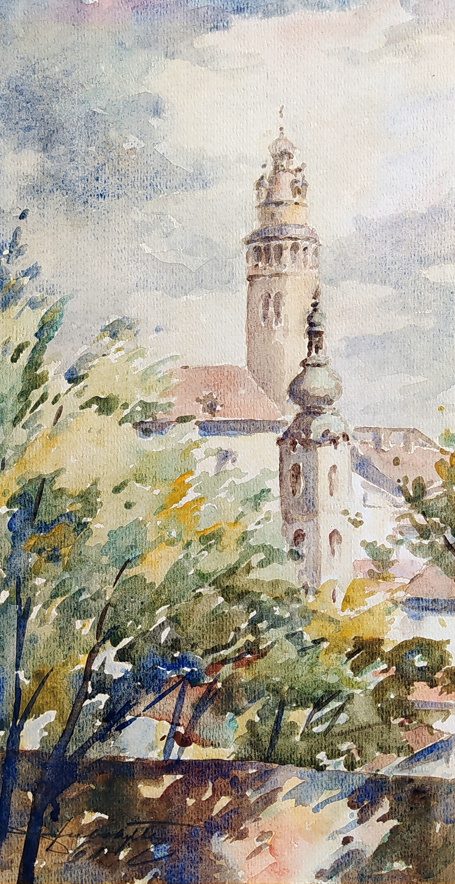 Dubský Vladimír – Zámek Český Krumlov, v popředí kostel sv. Jošta, malba akvarelem, 1961