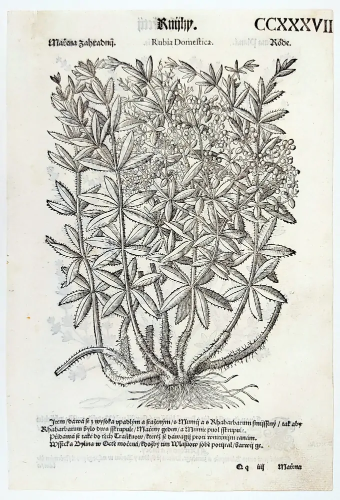 Mattioli Pietro Andrea – Mořena, původní dřevořez, 1562. List CCXXXVII. Mařena zahradnÿ. Rubia Domestica. / Mařena planá. Rubia Sylvestris.