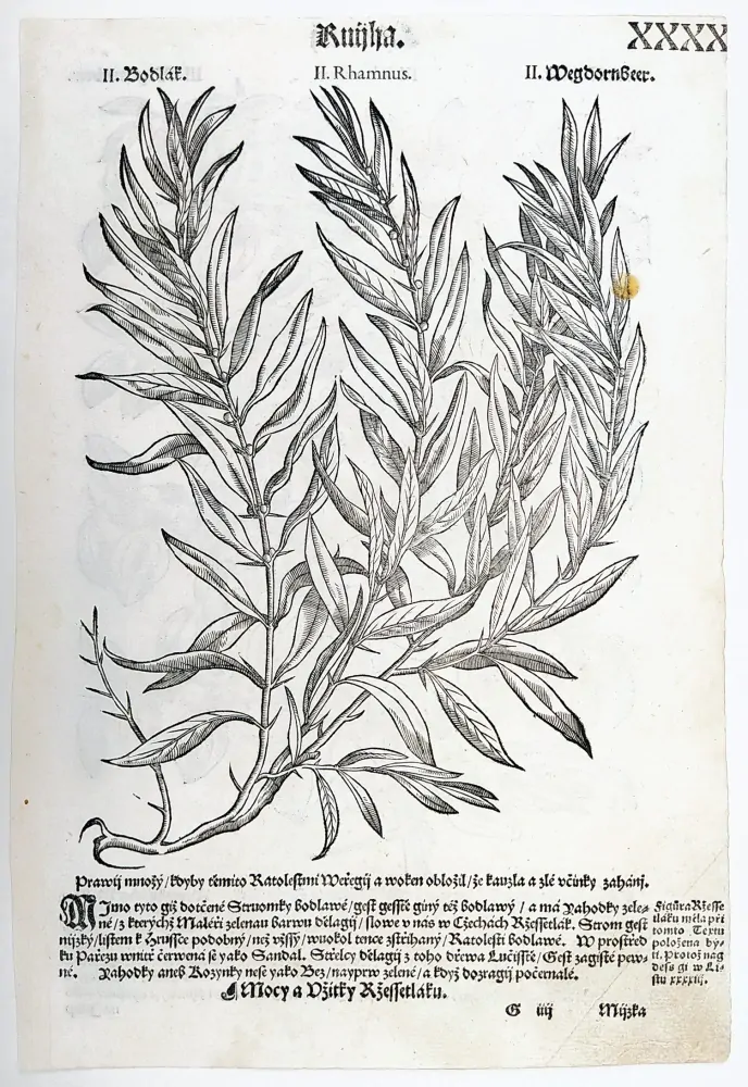 Mattioli Pietro Andrea –Řešetlák, původní dřevořez, 1562. List XXXX. Bodlák. Rhamnus./ Bodlák. Rhamnus.