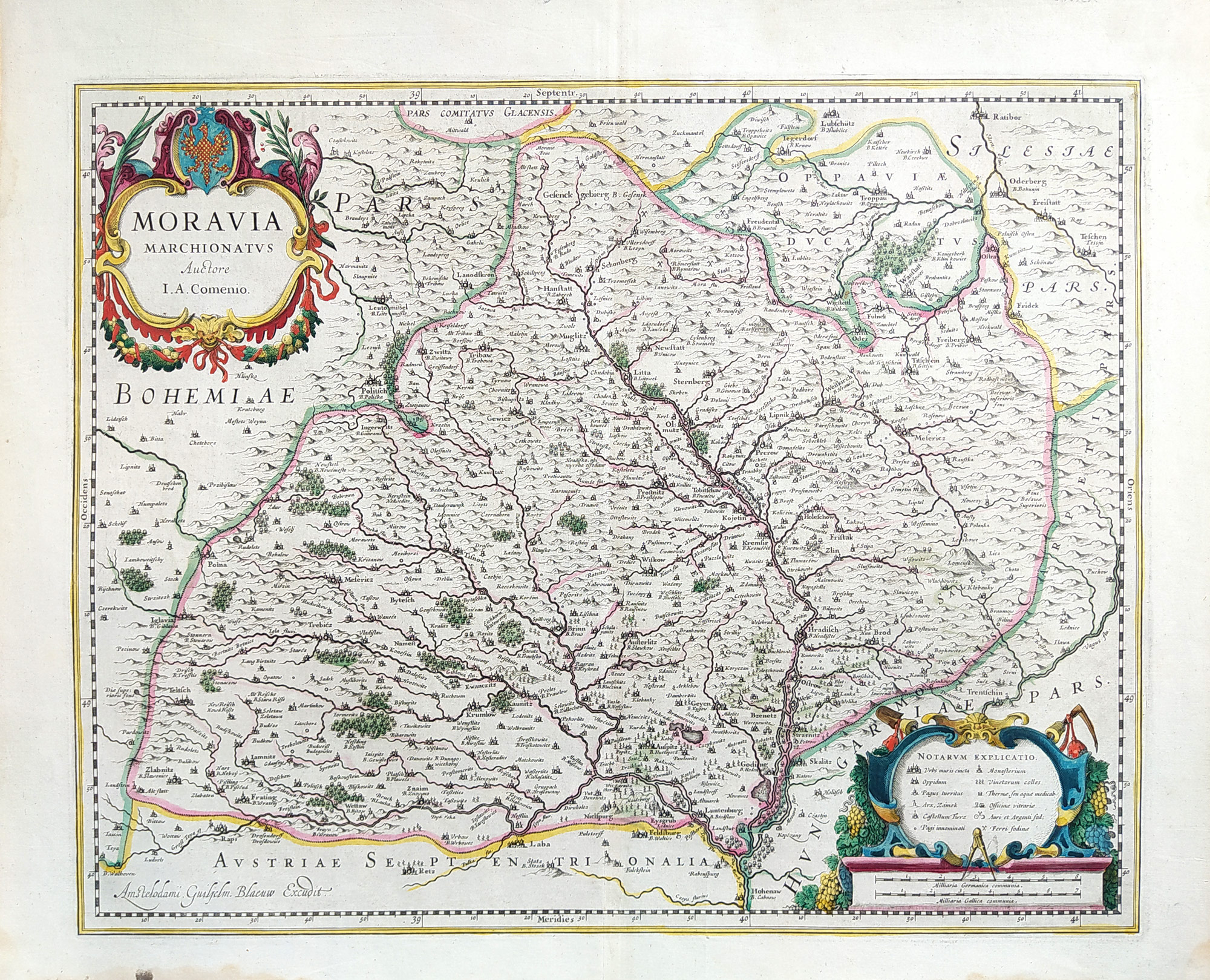 Mapa Moravy "Moravia Marchionatus Auctore I. A. Comenio". Staře kolorovaný původní mědiryt podle J. A. Komenského mapy Moravy. Vydal W. J. Blaeu v Amsterdamu, 1630. Mapa s ornamentální tit. kartuší s moravským erbem vlevo nahoře a další ornamentální kartuší s vysvětlivkami („Notarum explicatio“) vpravo dole. Celkový rozměr: 45,0 cm × 56,3 cm.