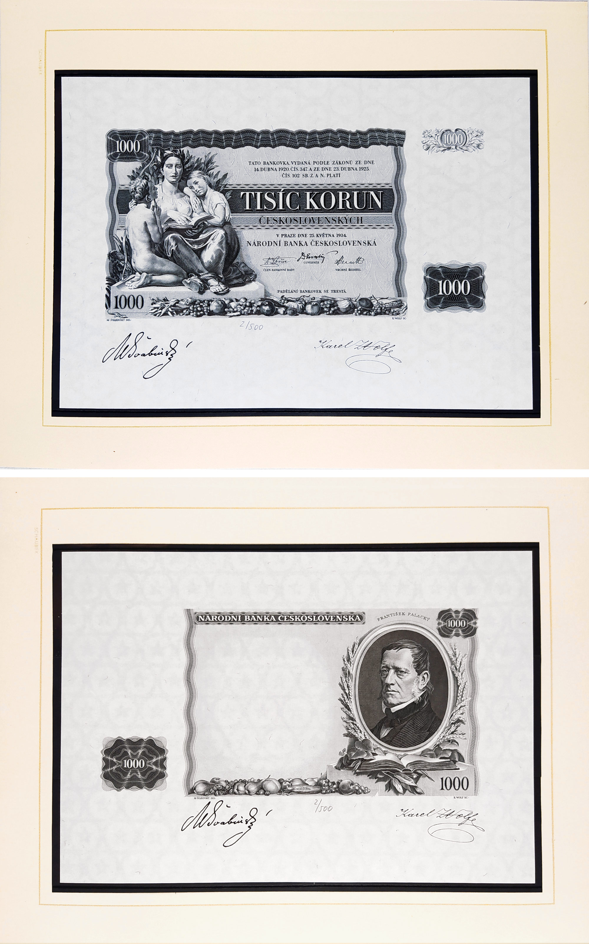 Státní tiskárna cenin, s.p. (STC Praha), 1984, Ceninový papír s vodoznakem (typ "hvězda v kruhu"). Hlubotisk - rytina, knihtisk (podpisy).Schirnböck Ferdinand, Švabinský Max – 2 ks návrh na bankovku 1000 Kčs, 25. 5. 1934. Číslováno 2/500. Celkový rozměr: 16,1 cm × 22,8 cm.