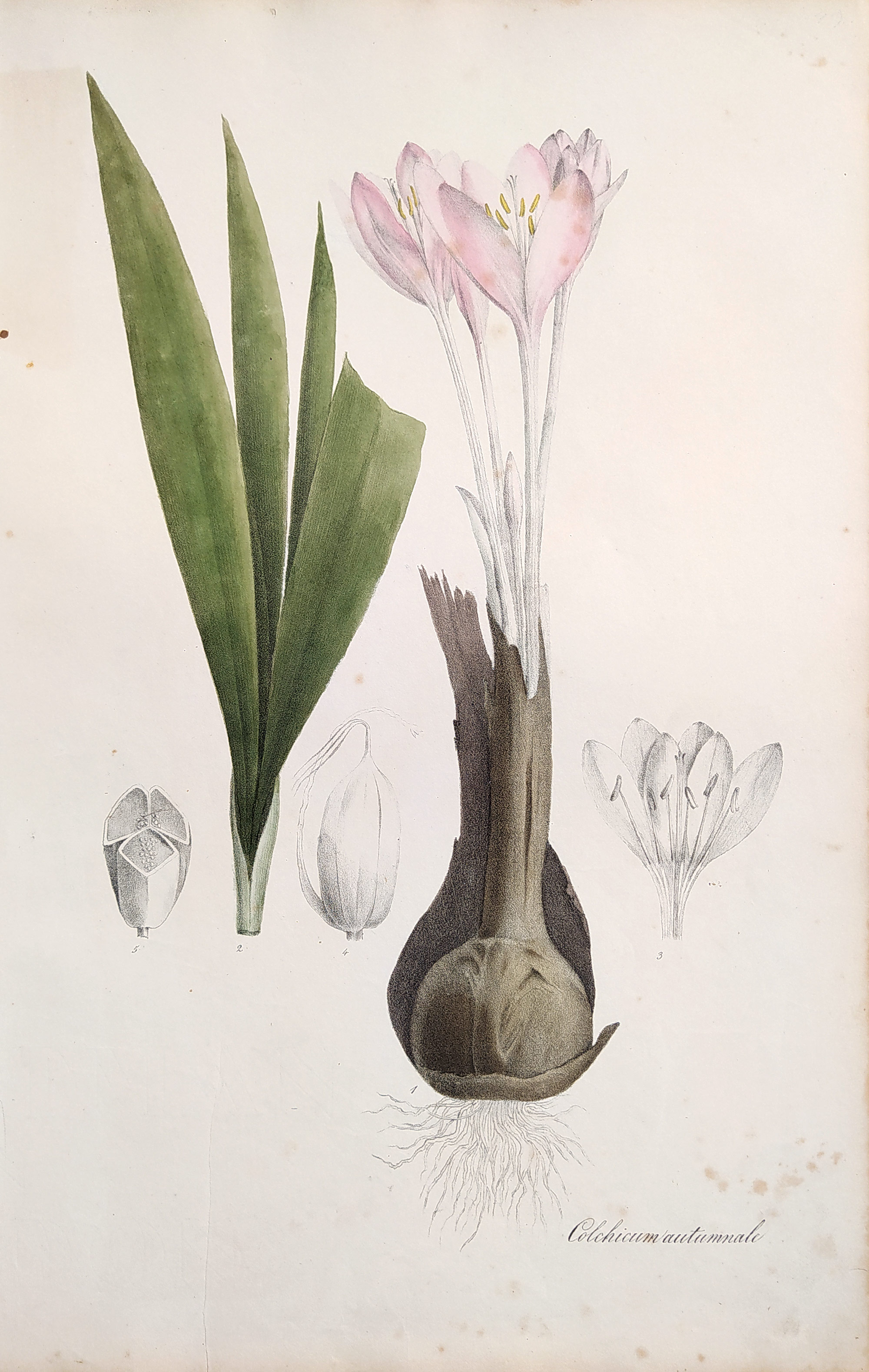 Nees von Esenbeck Th. Fr. L. – Ocún podzimní, Colchicum autumnale, staře kolorovaná původní litografie, 1828. Celkový rozměr: 46,8 cm × 29,1 cm.