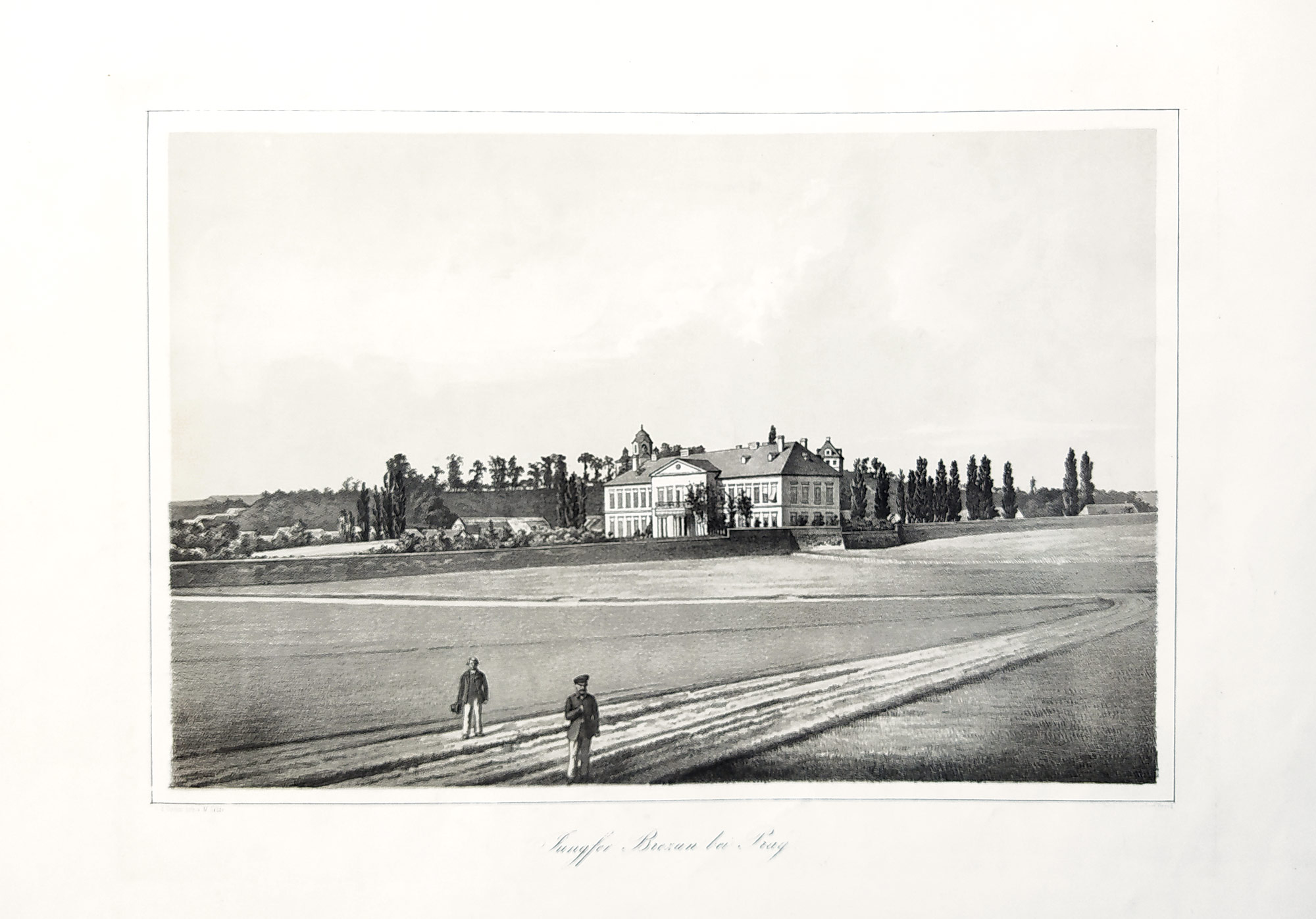 Panenské Břežany – Jungfer Brezan bei Prag, okres Praha–východ, původní tónovaná litografie, ca 1850. Litografoval M. Golde, vytiskl J. Braunsdorf v Drážďanech. Celkový rozměr listu: 30,3 cm × 42,1 cm.
