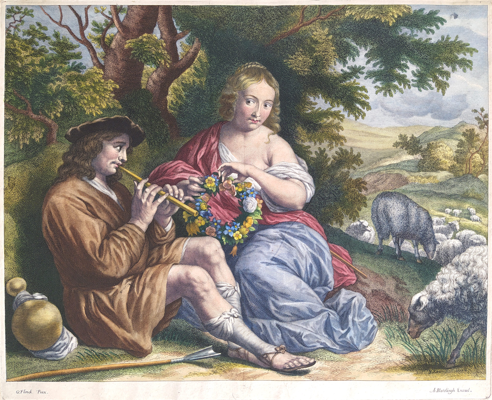 Pastýřský motiv, kolorovaný mědiryt, ca 1670. Podle předlohy Govaerta Flincka vyryl Carl Abraham Bloteling. Celkový rozměr: 44,0 cm × 53,9 cm.