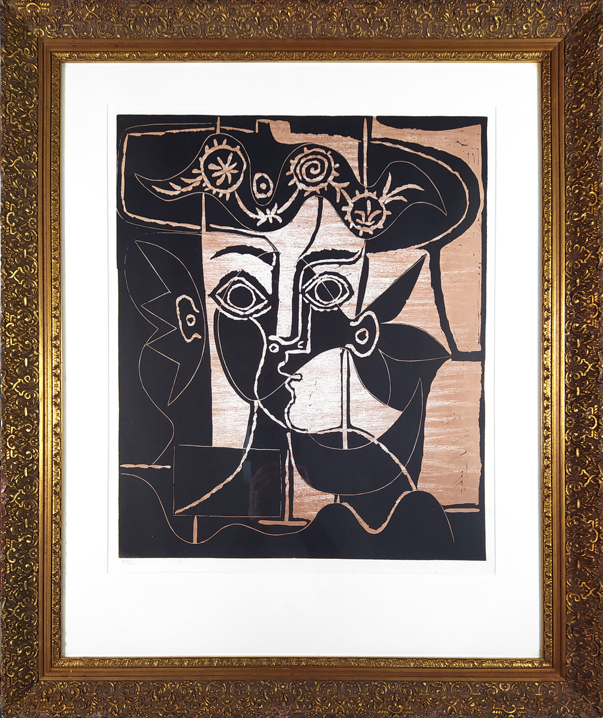 Picasso Pablo – Grande tête de femme au chapeau orné, dvoubarevný linoryt na papíře Arches, 1963. Nesignovaný linoryt, číslováno 217/300. Celkový rozměr v rámu: 95,1 cm × 78,8 cm.