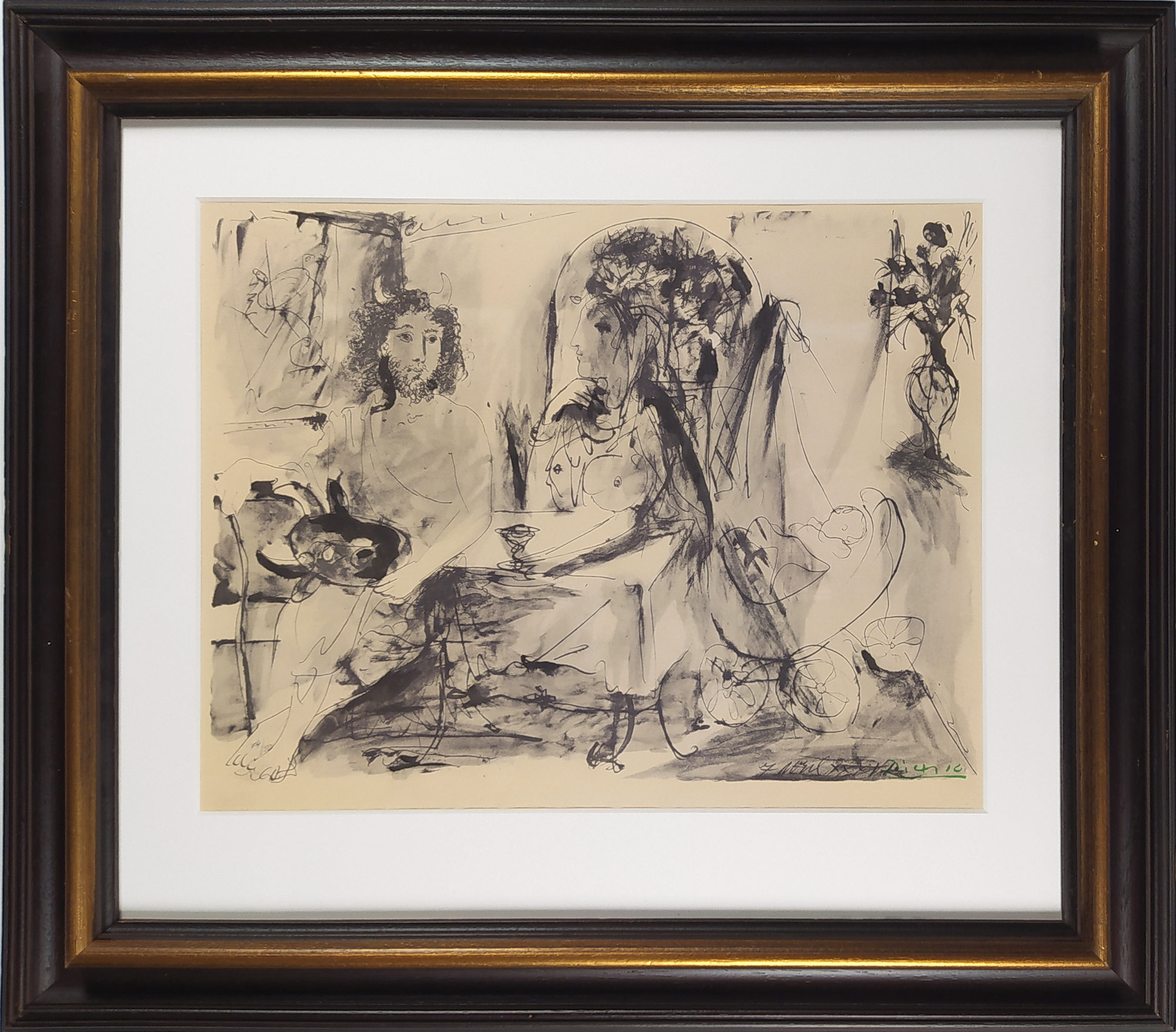 Pablo Picasso (1881–1973). Mladý faun, žena a dítě, litografie z roku 1967. Vytištěno na papíře Auvergne Richard de Bas. Vydavatel: Au Vent d'Arles, Paříž. Signováno v desce vpravo dole, číslováno 74/500. Celkový rozměr v rámu: 70,6 cm × 80,5 cm.
