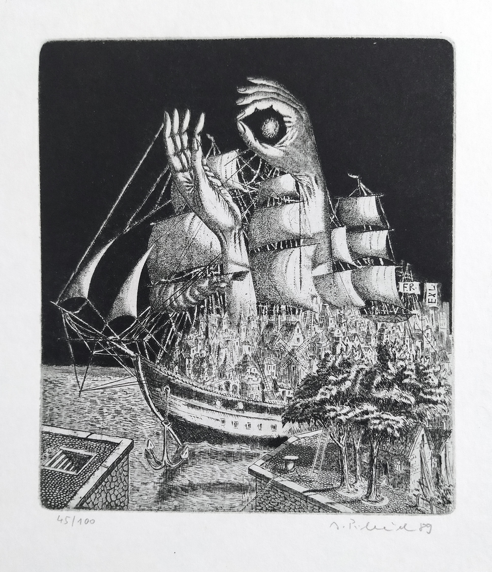 Pileček Jindřich – Ex libris F. R., původní lept, č. 45/100, 1989. Signováno tužkou vpravo dole s datací. Celkový rozměr: 24,8 cm × 16,3 cm.
