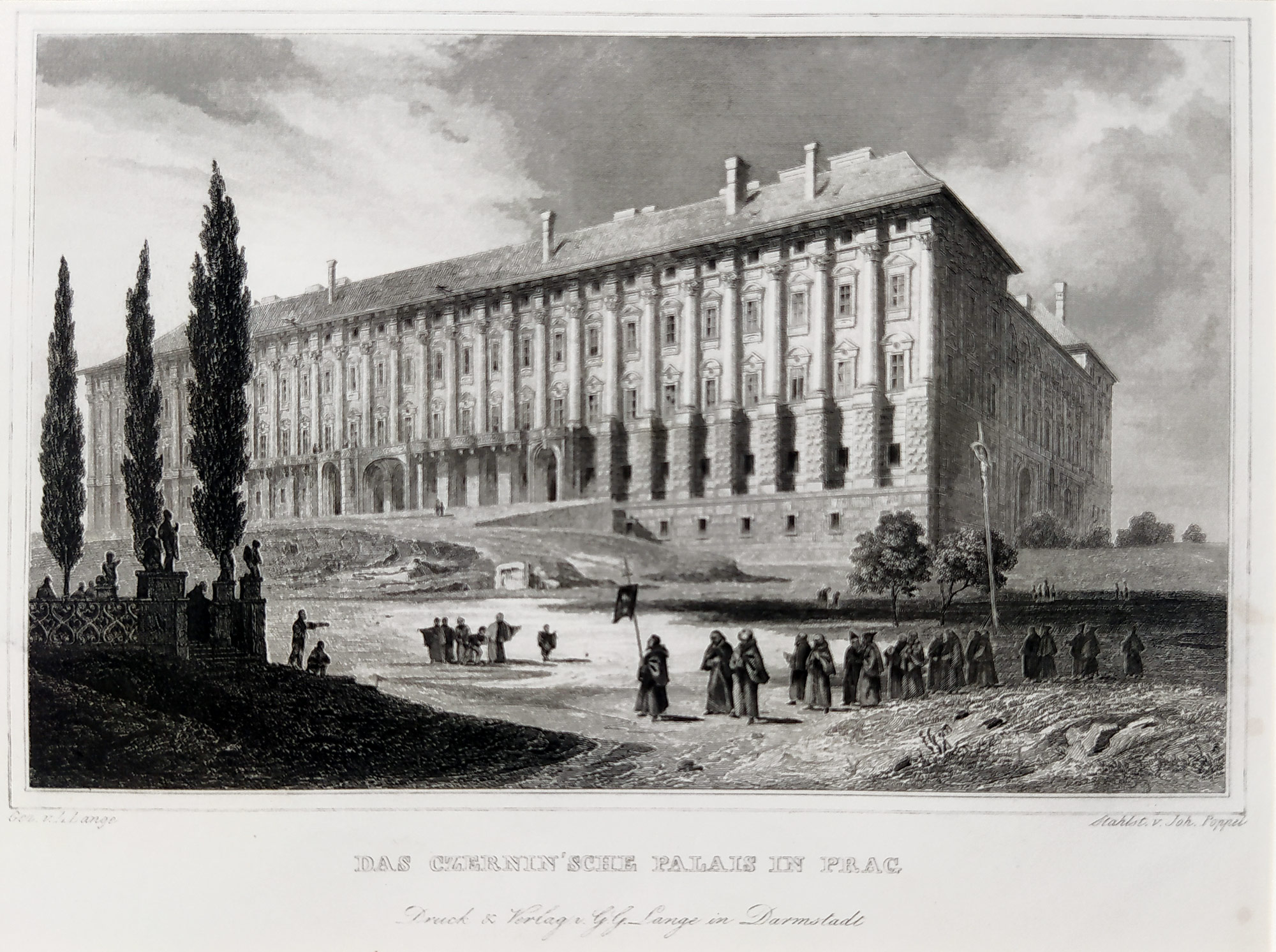 Praha – Černínský palác. Název listu pod vyobrazením: „Das Czernin'sche Palais in Prag“. Původní oceloryt podle předlohy Ludwiga Langeho vyryl Johann G. F. Poppel. Vydal C. G. Lange v Darmstadtu ca 1830. Celkový rozměr v muzeální paspartě: 25,5 cm × 28,6 cm.