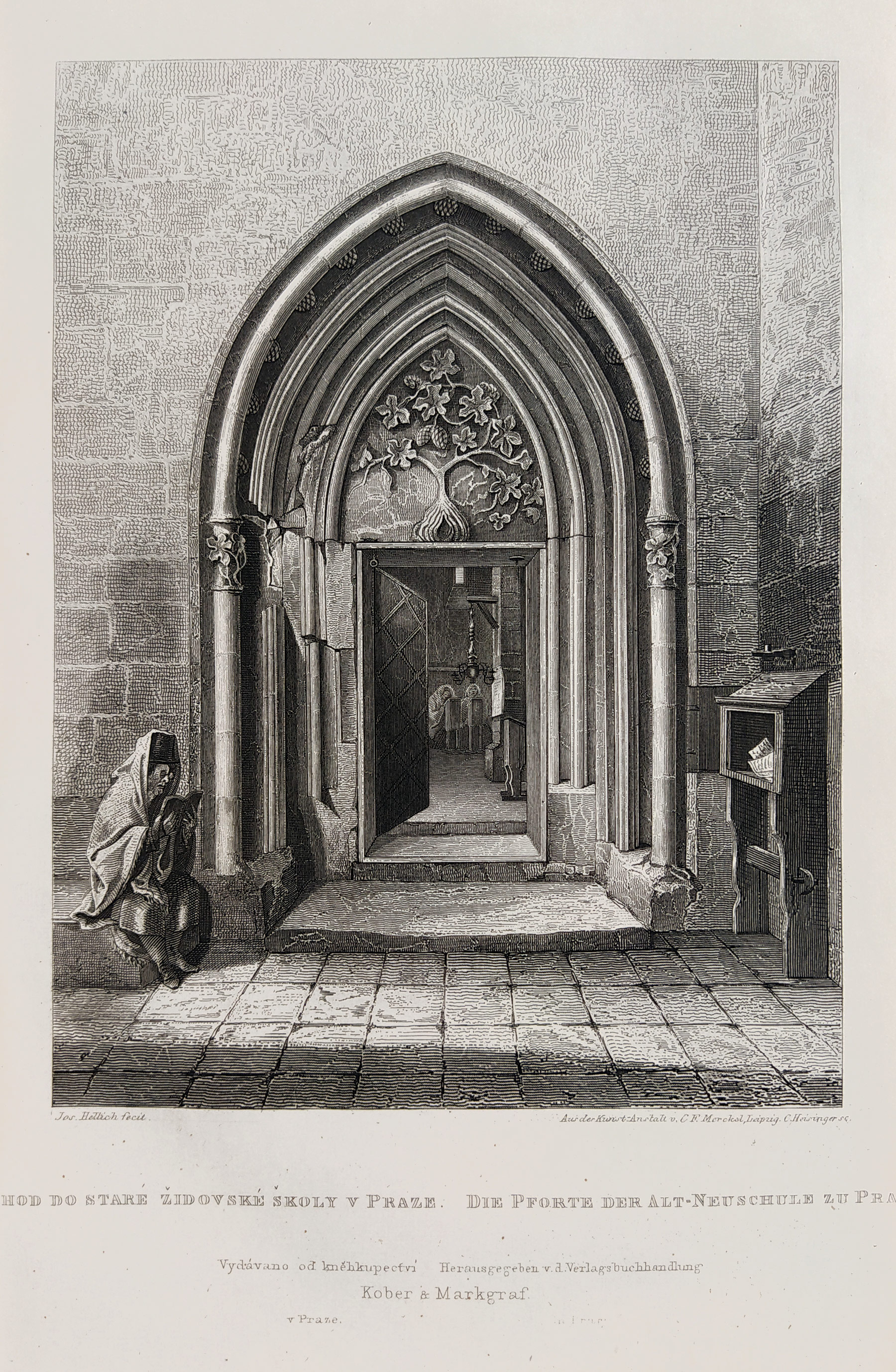 Praha – Staronová synagoga v Praze. Pod vyobrazením dvoujazyčný název listu: „Vchod do staré židovské školy v Praze. Die Pforte der Alt-Neuschule zu Prag“. Podle kresebné předlohy J. V. Hellicha vyryl G. Heisinger. Vydal I. L. Kober v Praze, 1860. Celkový rozměr v muzeální paspartě: 34,5 cm × 26,1 cm.