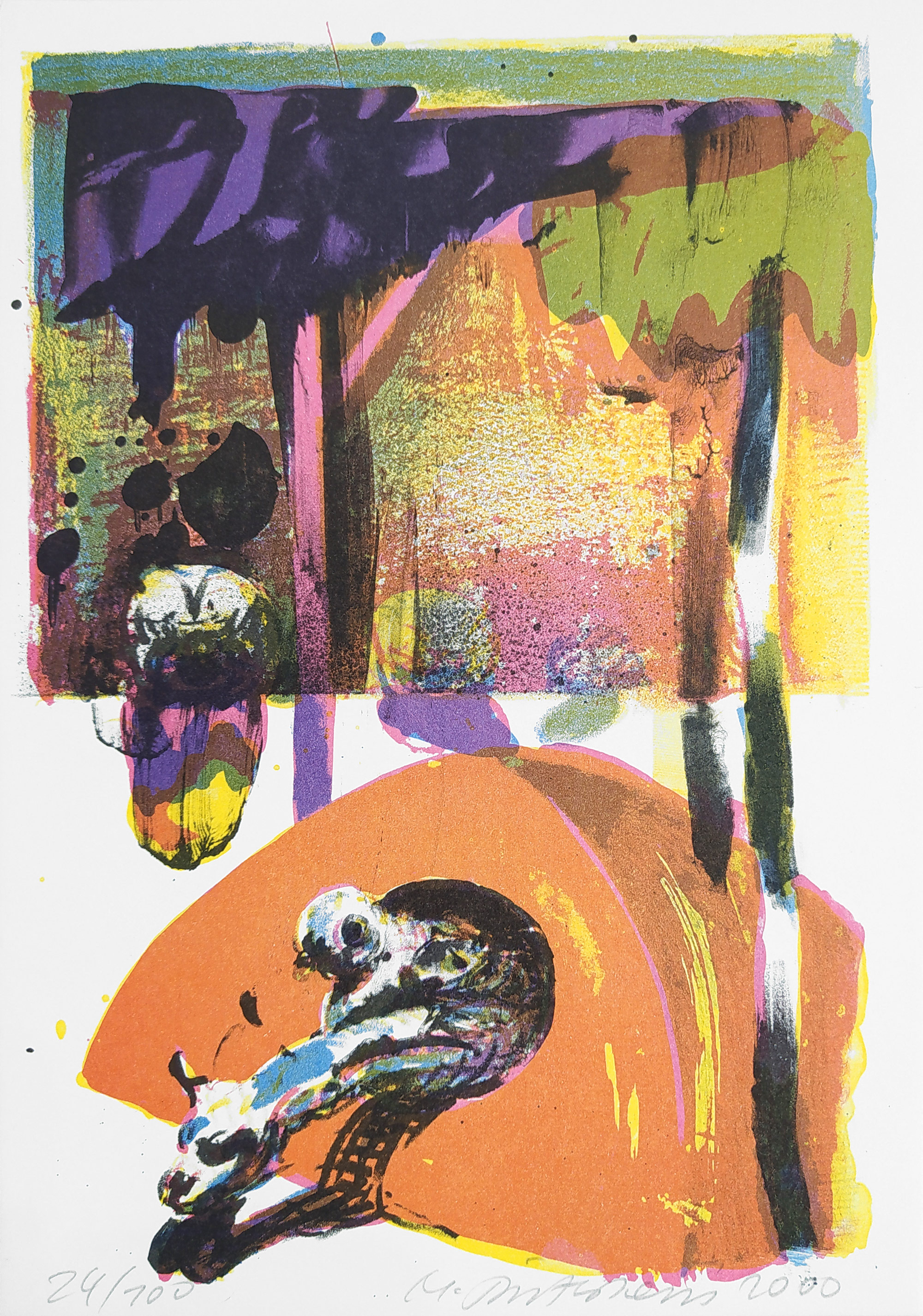 Michael Rittstein – Bez názvu, barevná litografie, č. 24/100, 2000. Signováno tužkou vpravo dole s datací. Celkový rozměr: 29,3 cm × 20,6 cm.