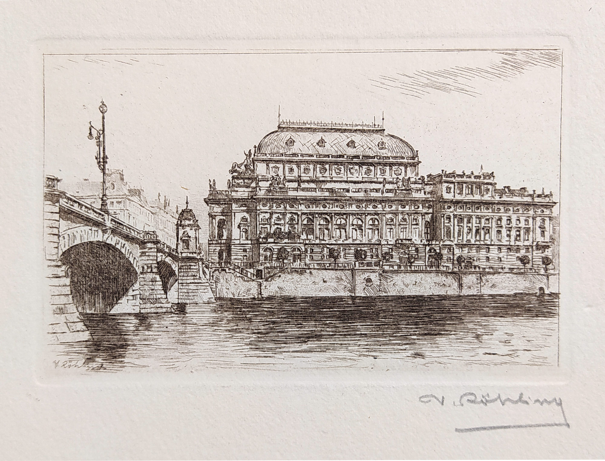 Röhling Vladislav – Praha, Národní divadlo, původní lept, ca 1930. V levé části grafiky je vidět část Mostu Legií (dříve mostu císaře Františka Josefa I.), který s budovou divadla bezprostředně sousedí. Tato konkrétní Röhlingova grafika byla ve své době reprodukována jako pohlednice. Celkový rozměr: 30 cm × 23 cm.