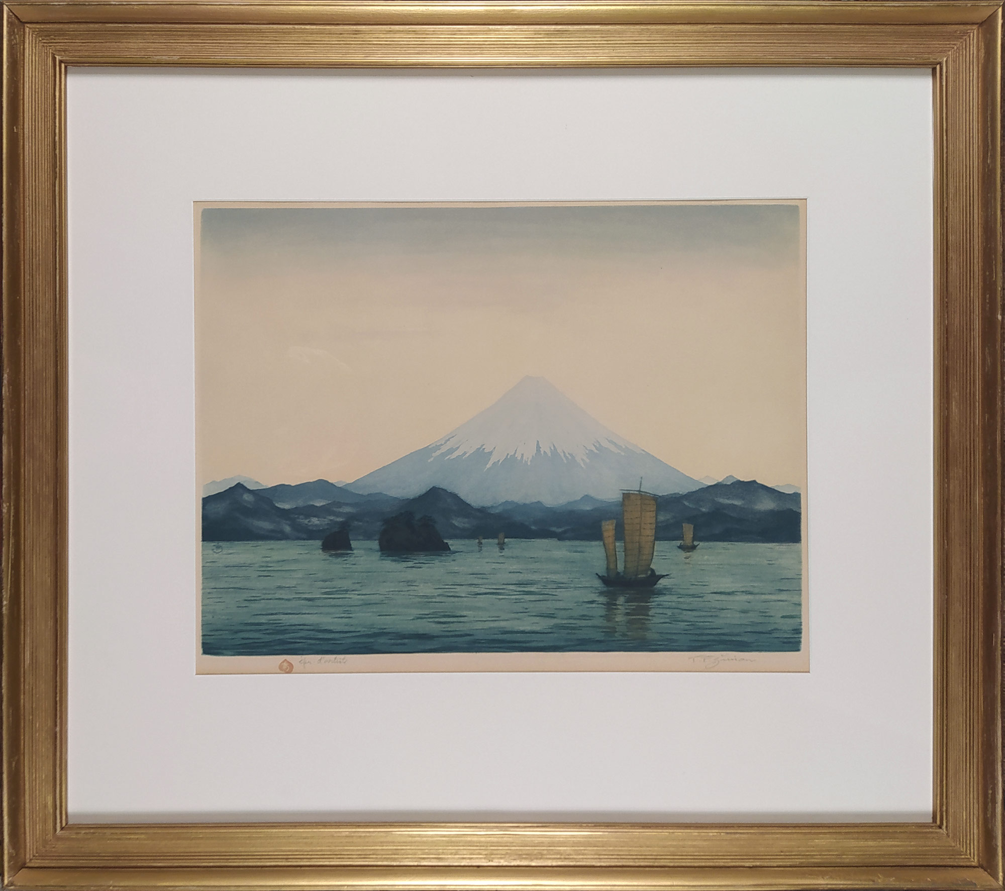 František Tavík Šimon – Hora Fuji v Japonsku, barevný lept, autorský tisk, 1928. V soupisu grafického díla T. F. Šimona od Arthura Nováka pod č. 476. Celkový rozměr v rámu: 56,2 cm × 63,2 cm.
